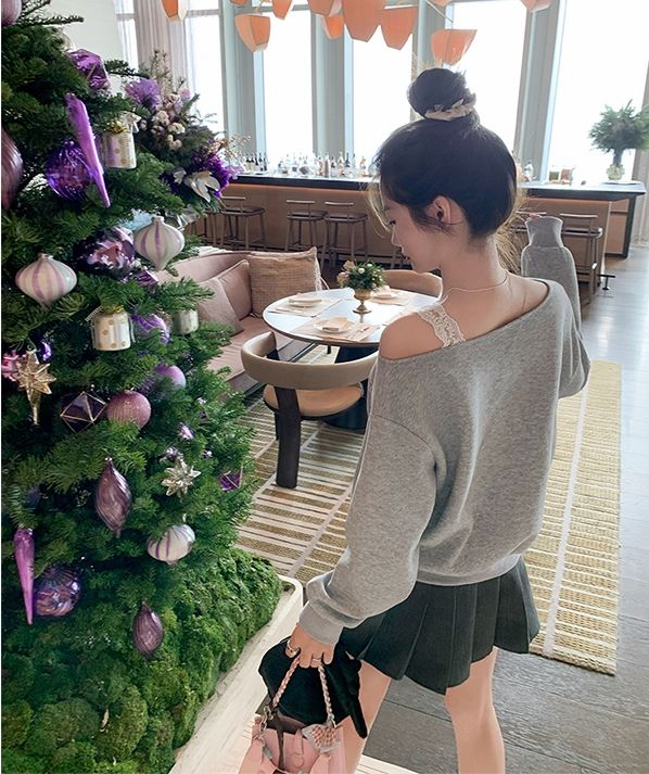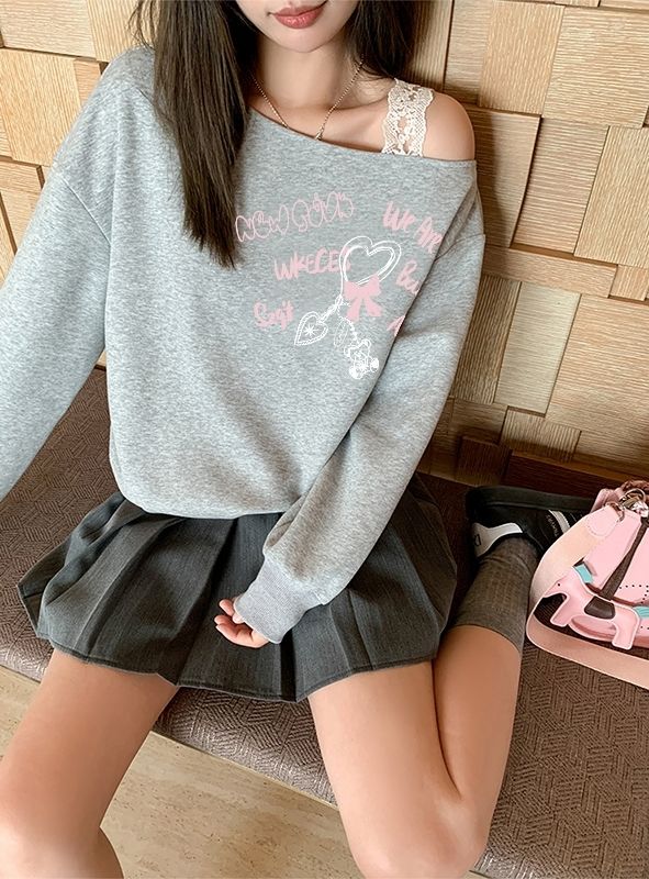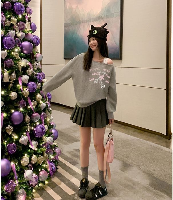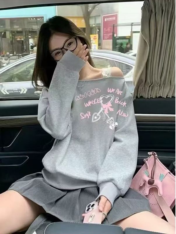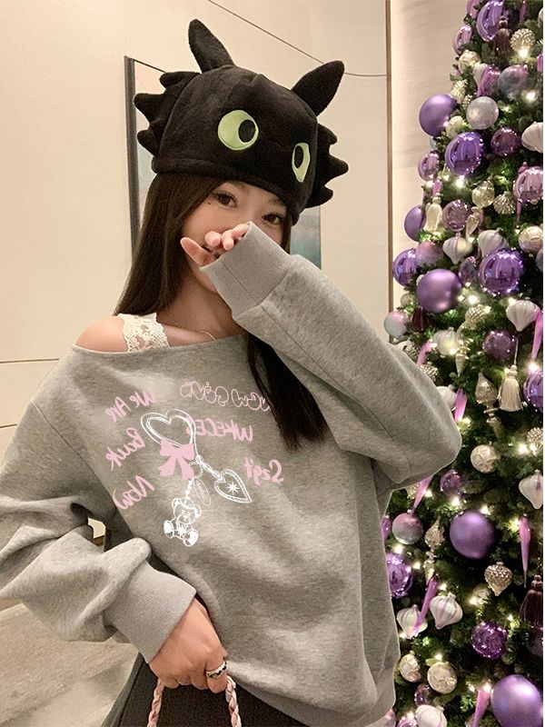印字斜領露肩寬鬆長袖T恤(預購)pn003078