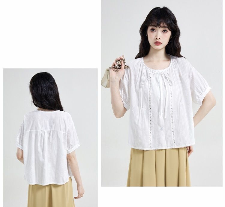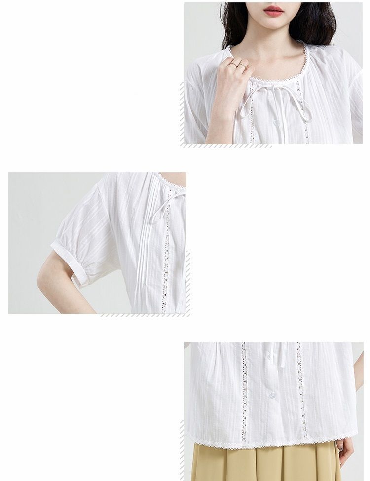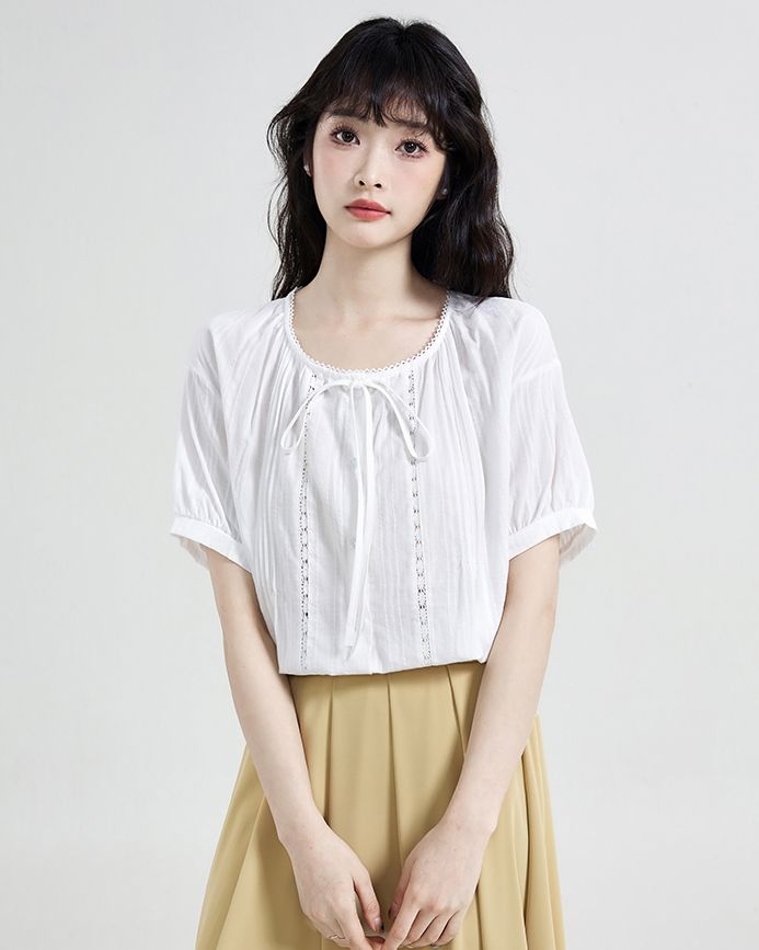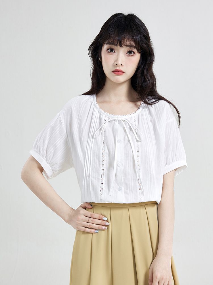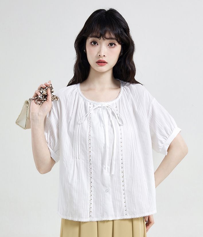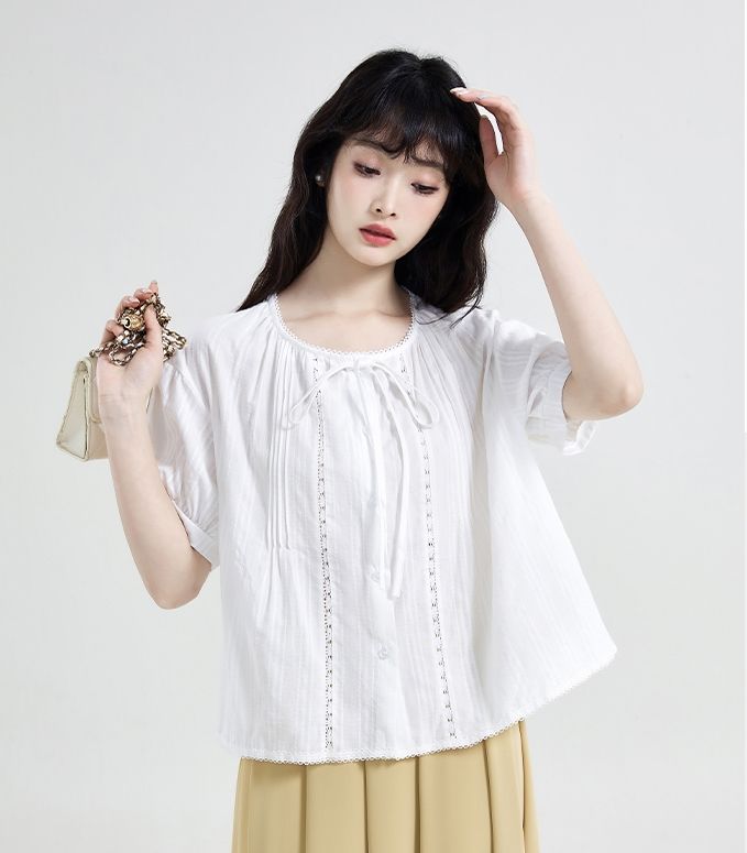 夏季圓領繫帶蕾絲上衣(預購)vic005320
