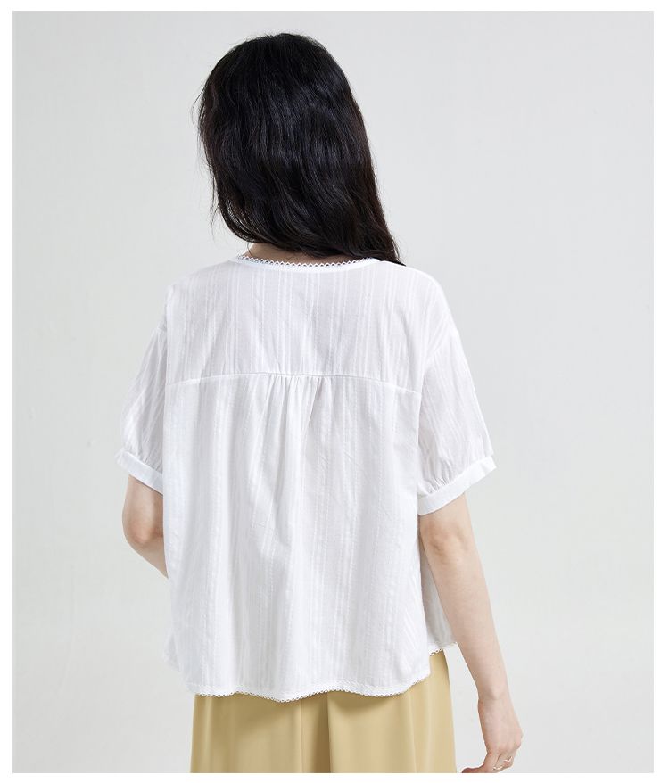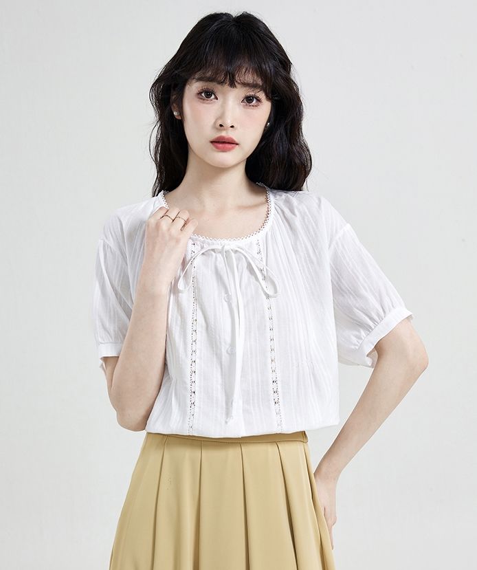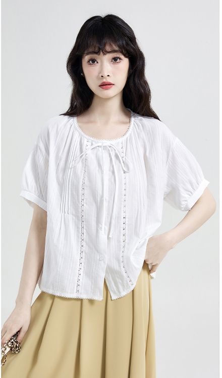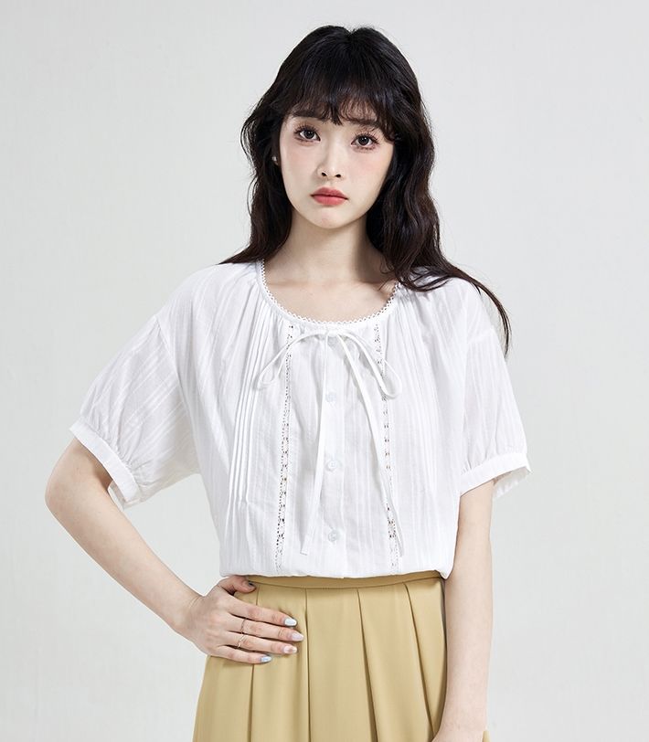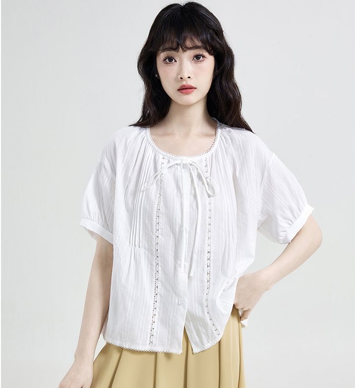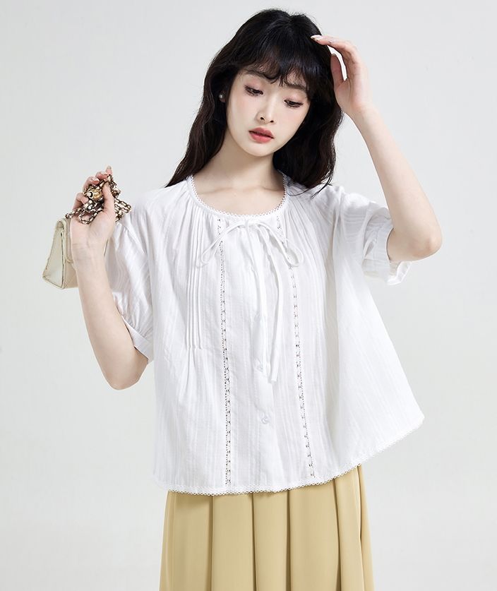 夏季圓領繫帶蕾絲上衣(預購)vic005320