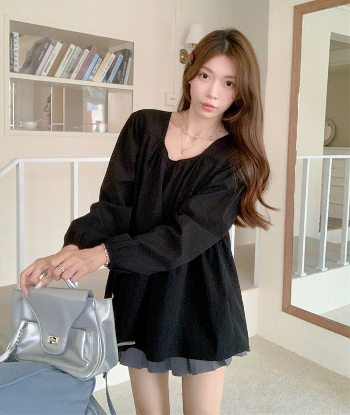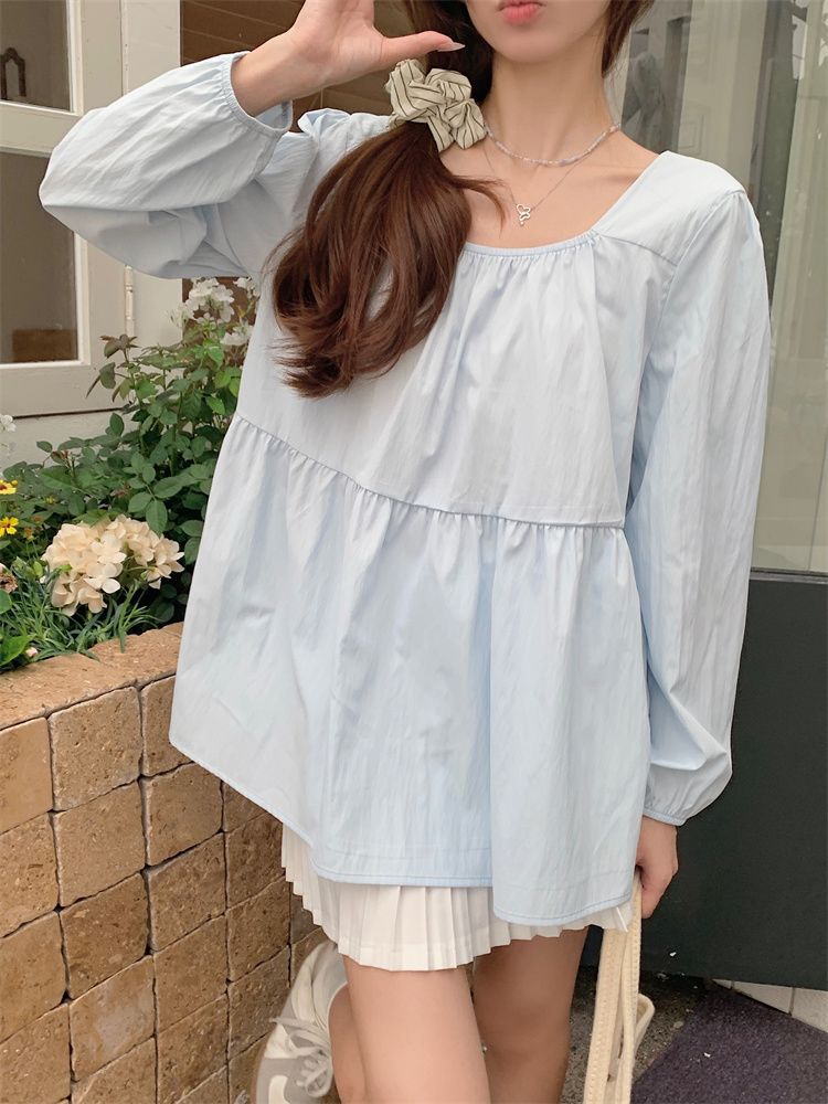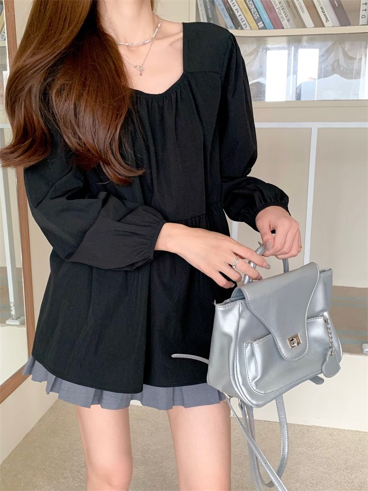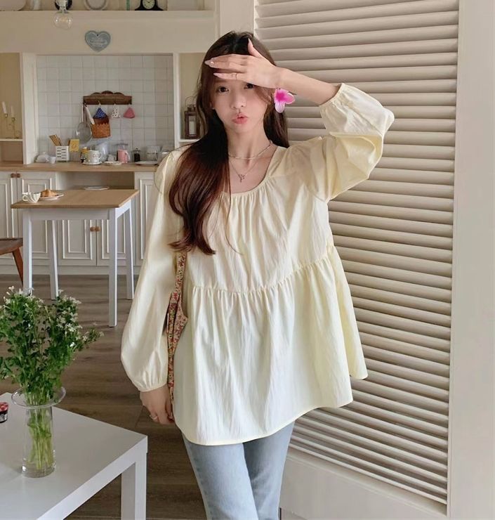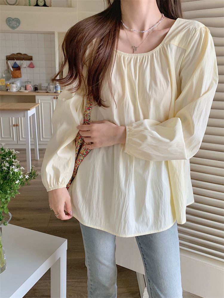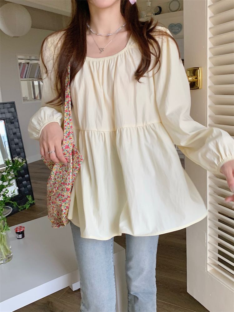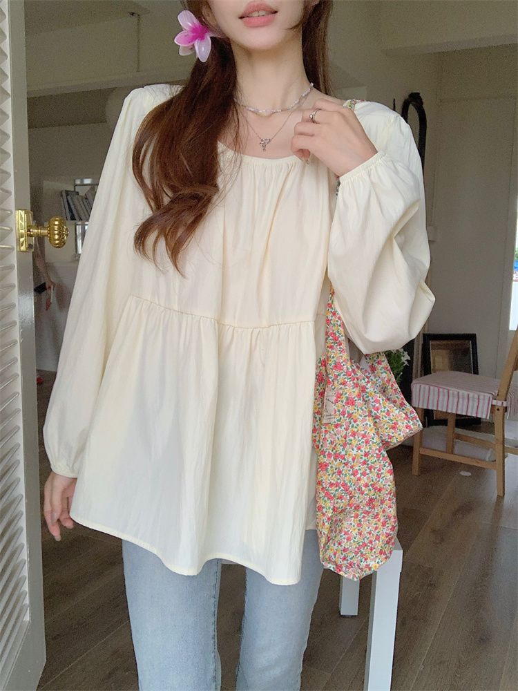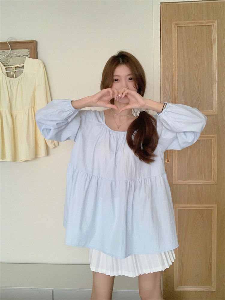 多尺碼甜美方領寬鬆收腰顯瘦長袖上衣(預購)vic005395