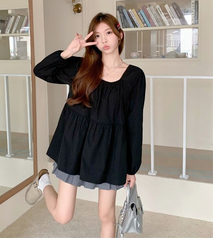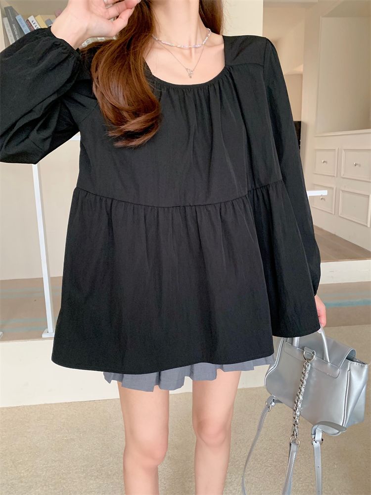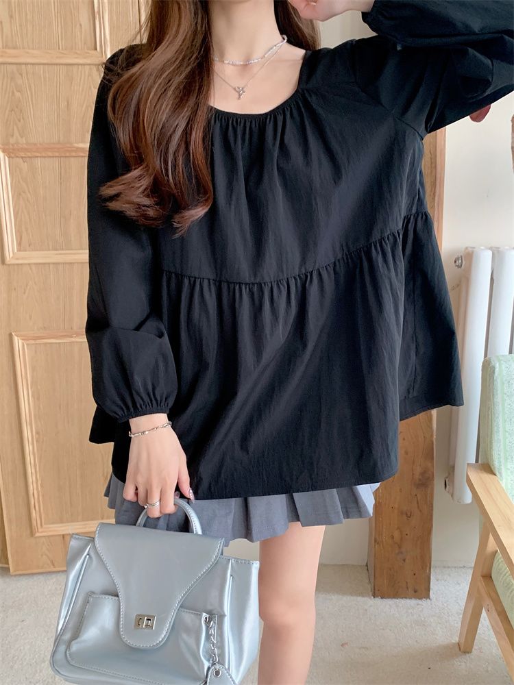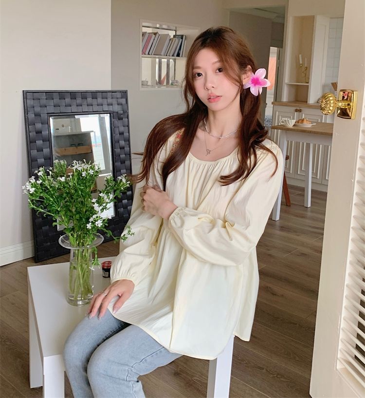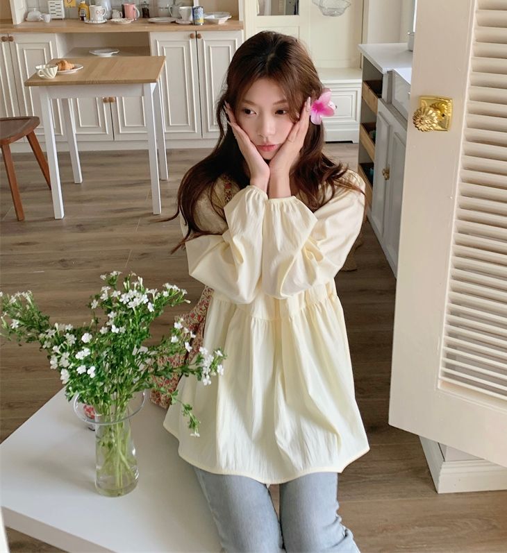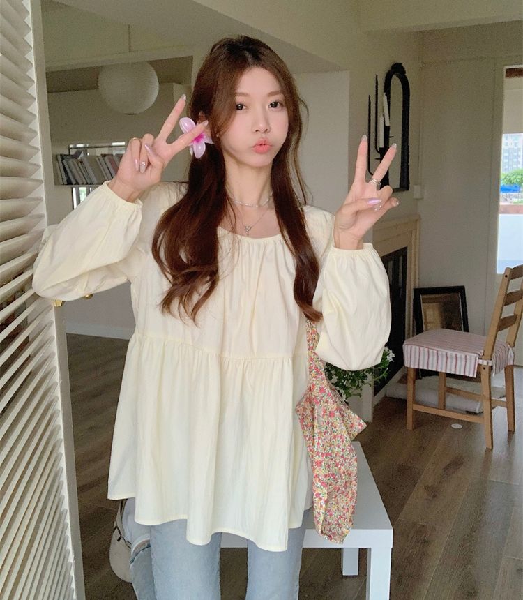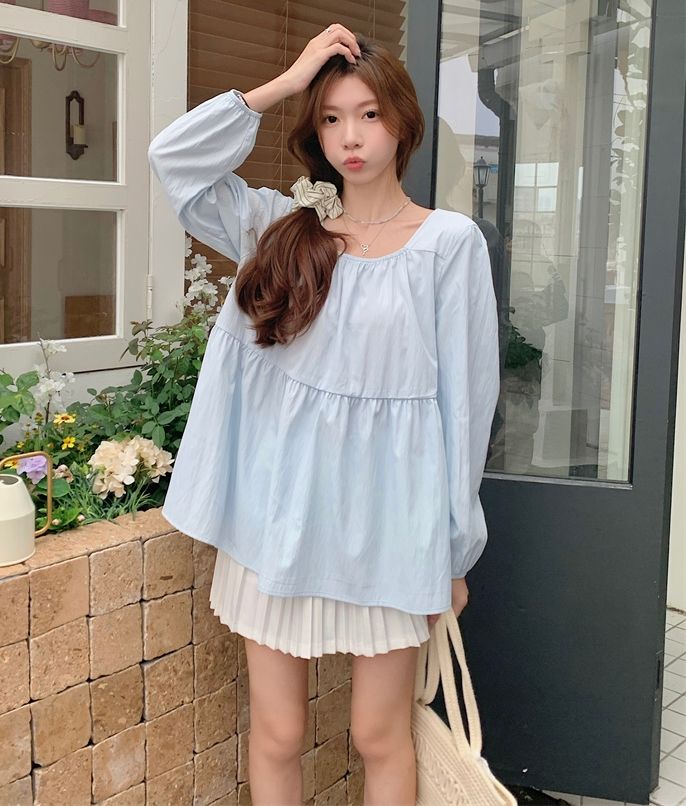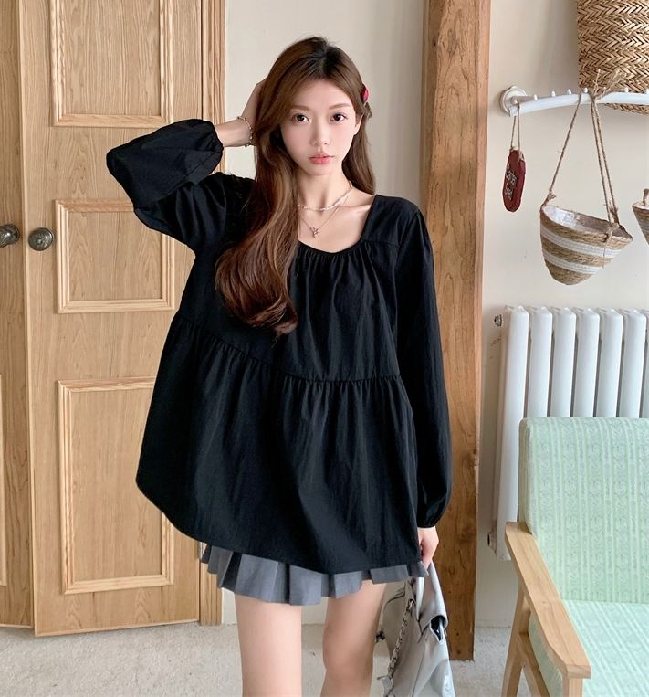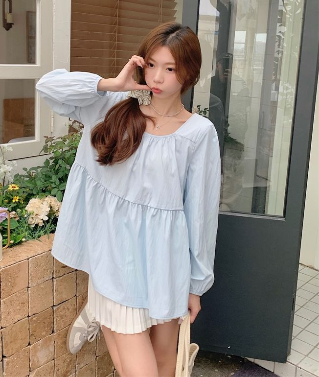 多尺碼甜美方領寬鬆收腰顯瘦長袖上衣(預購)vic005395