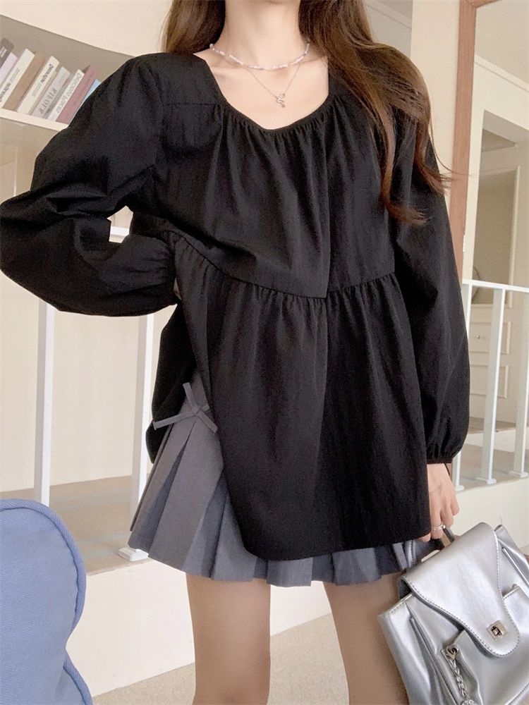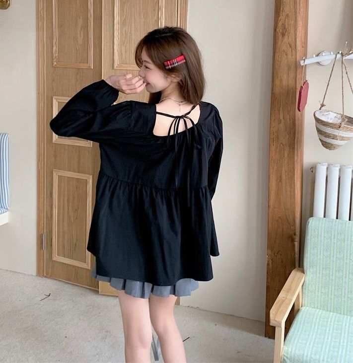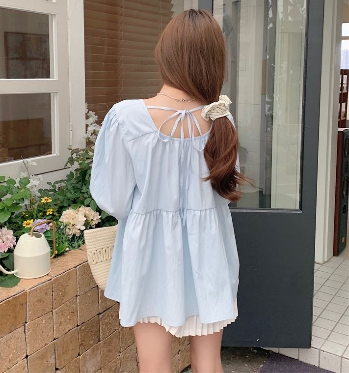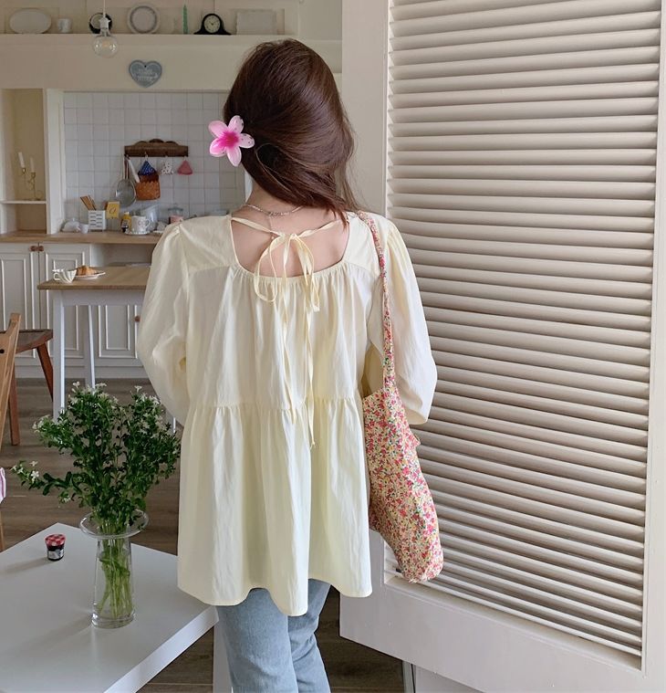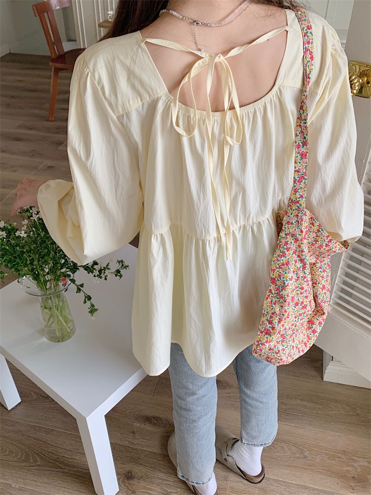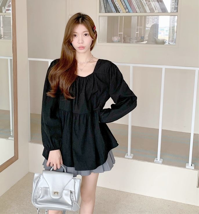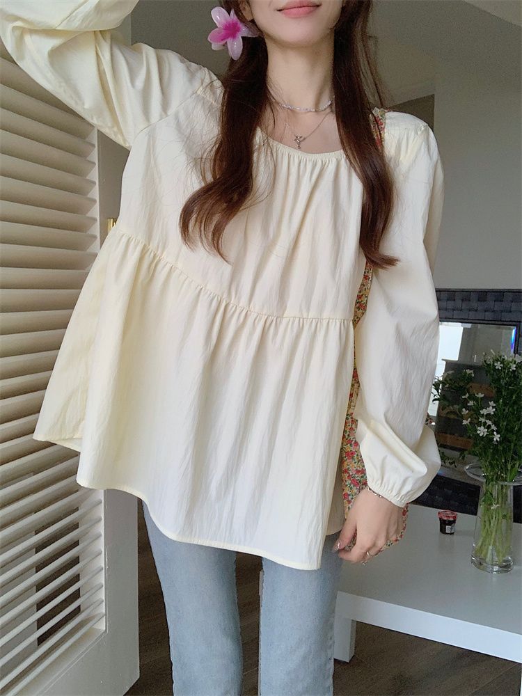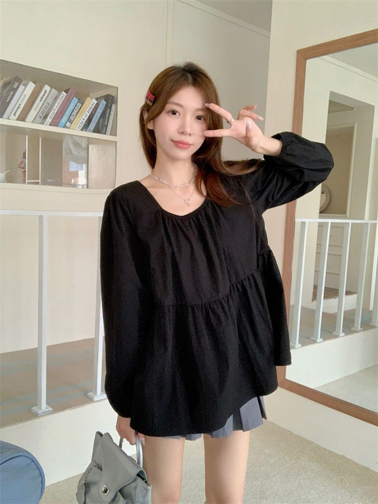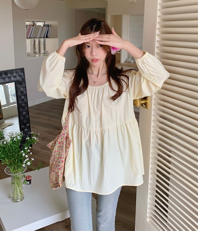 多尺碼甜美方領寬鬆收腰顯瘦長袖上衣(預購)vic005395