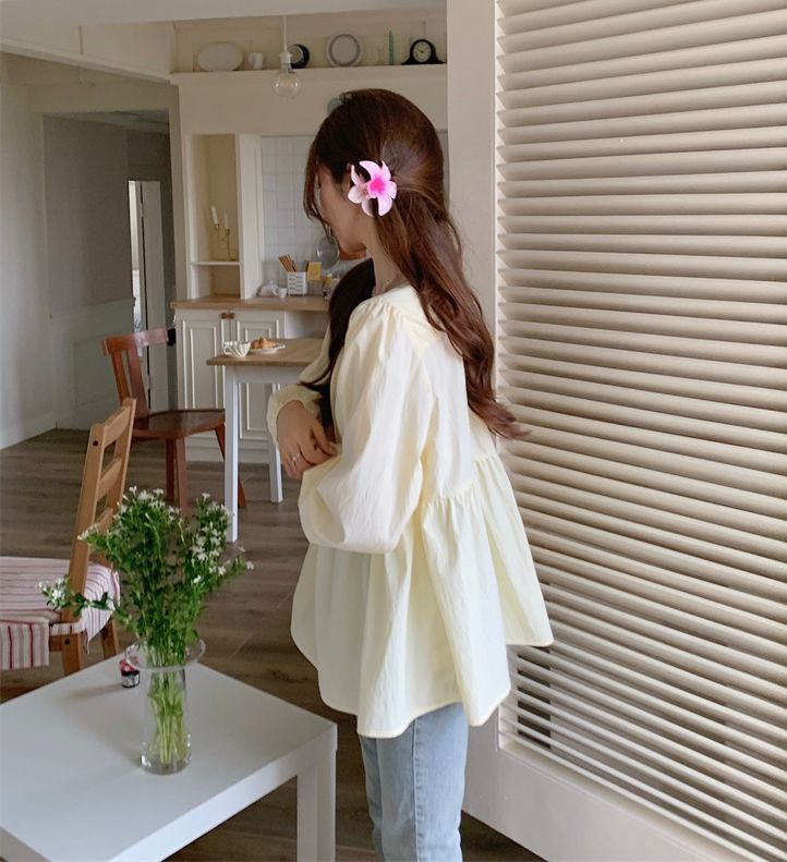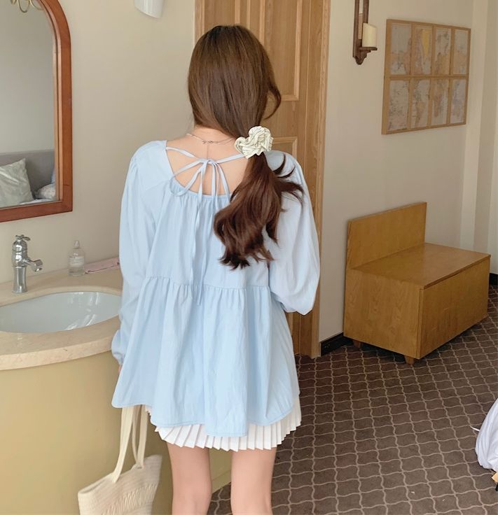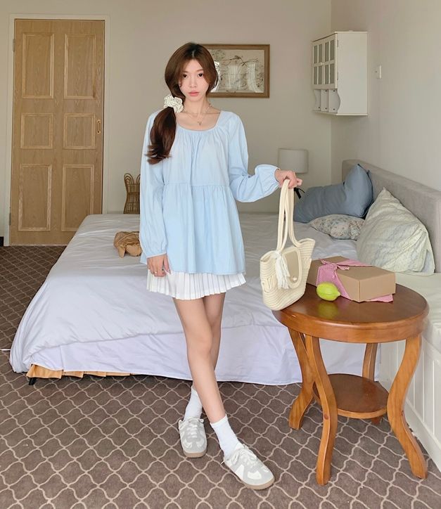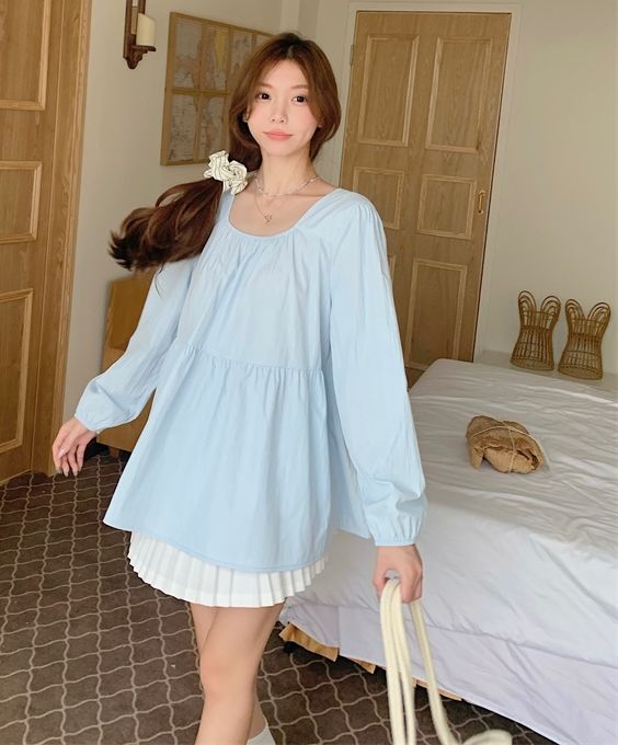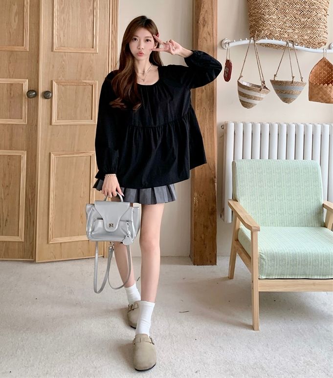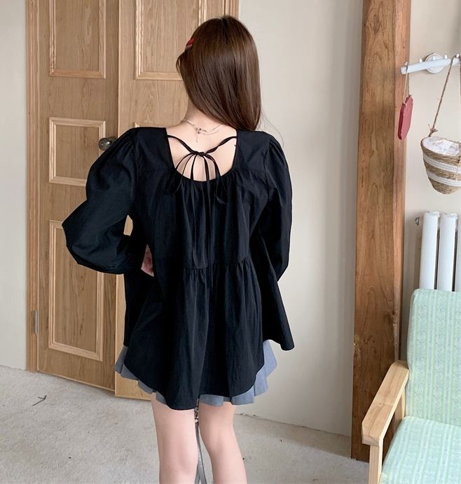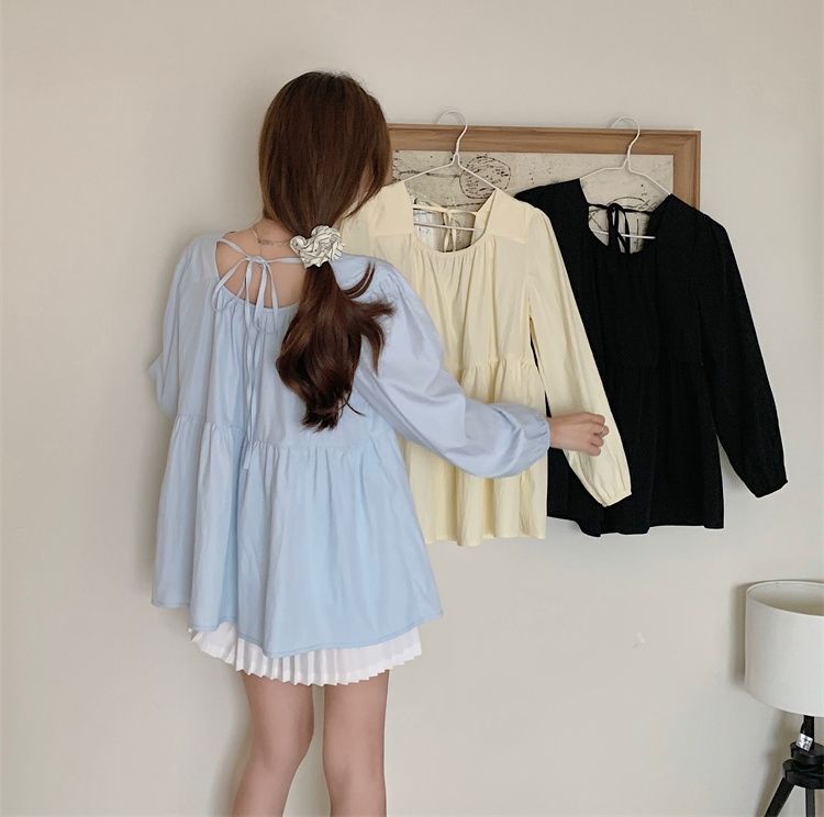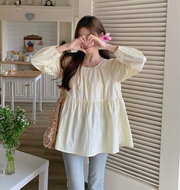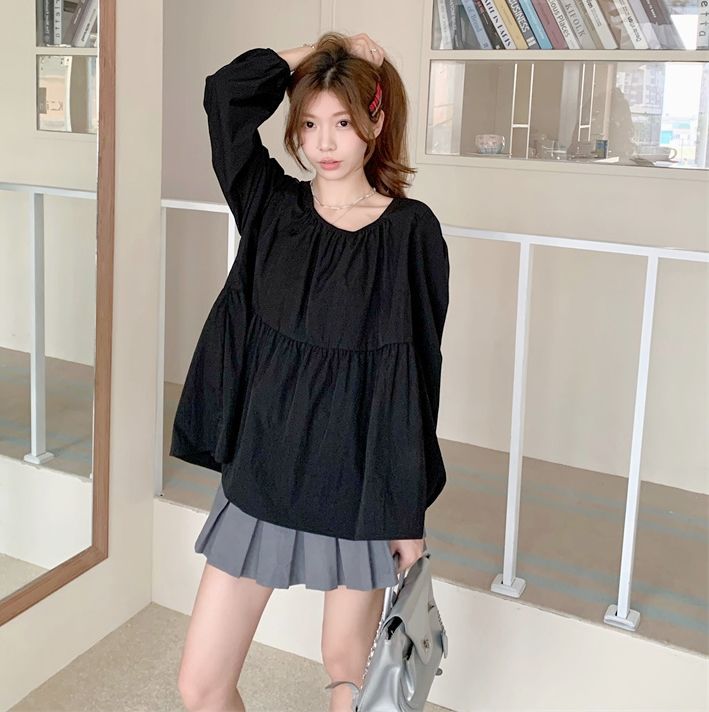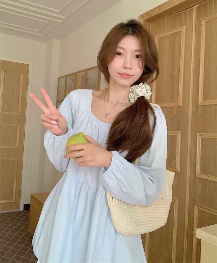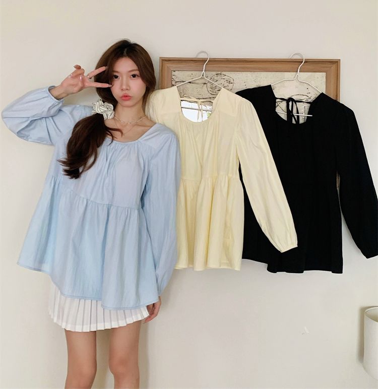 多尺碼甜美方領寬鬆收腰顯瘦長袖上衣(預購)vic005395