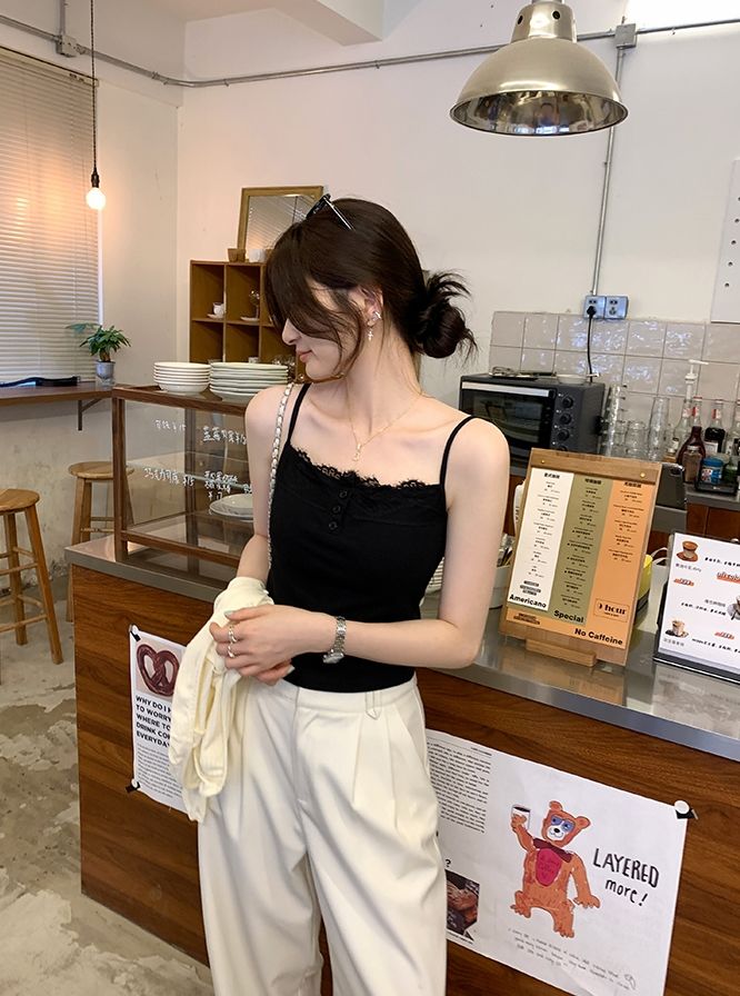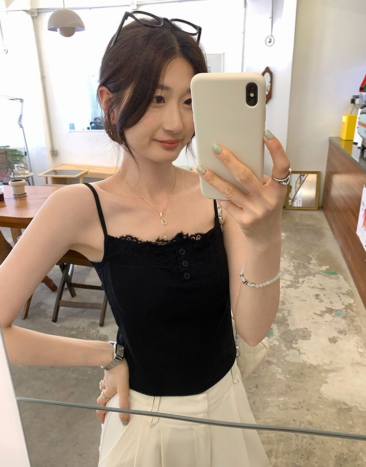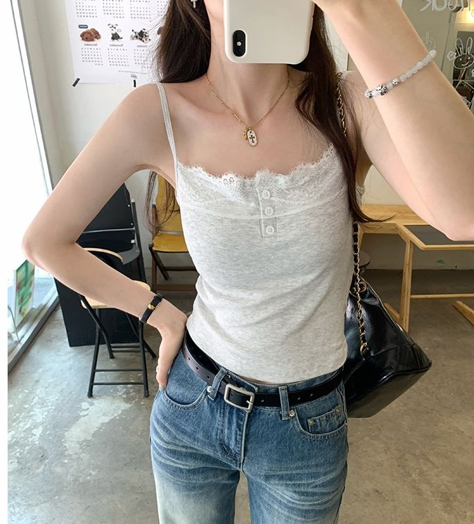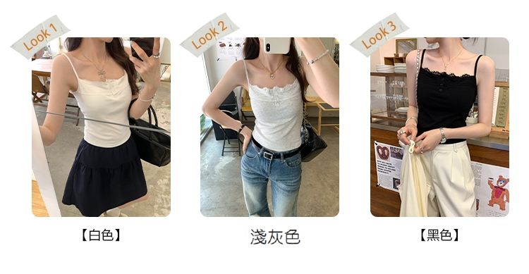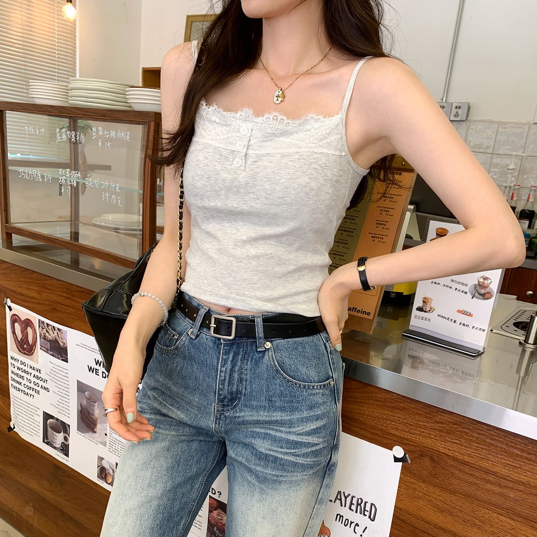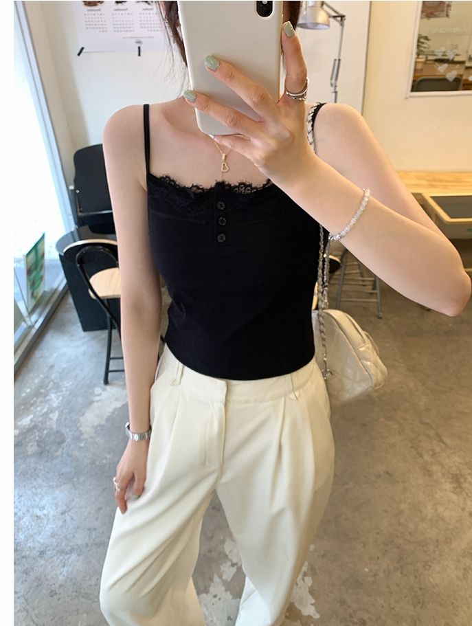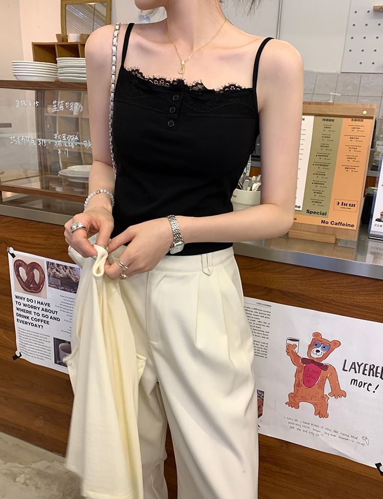 新款帶胸墊蕾絲拼接無袖吊帶背心