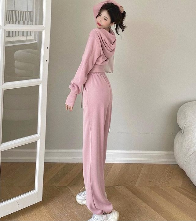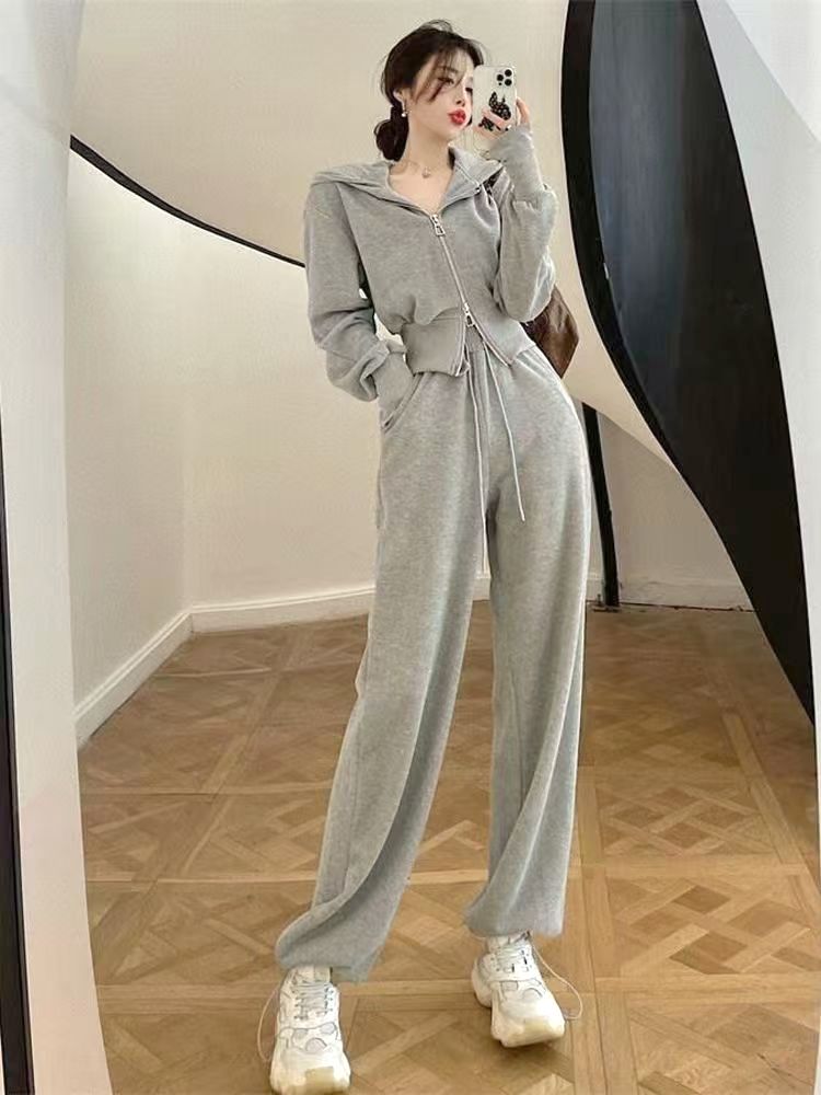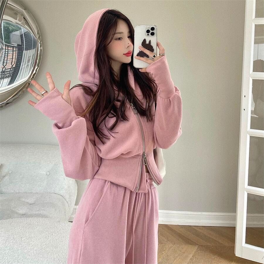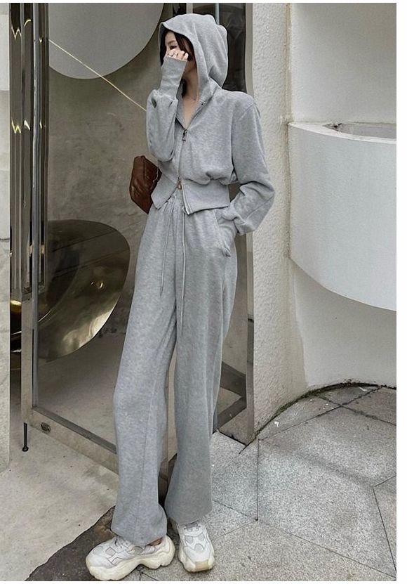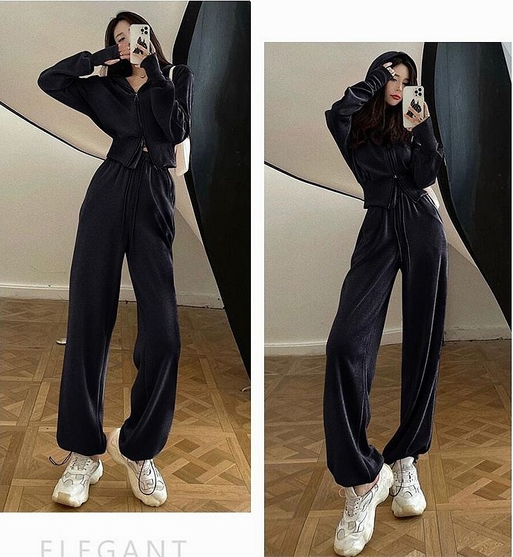 時尚連帽拉鍊外套+運動長褲兩件式套裝