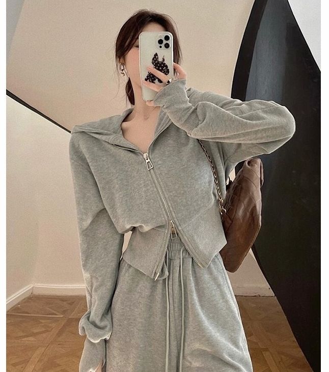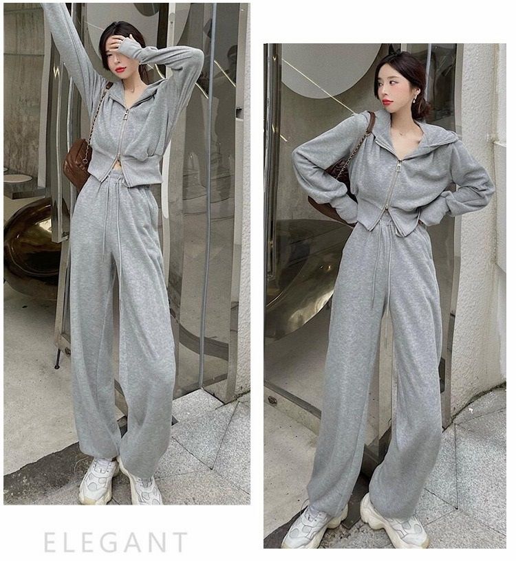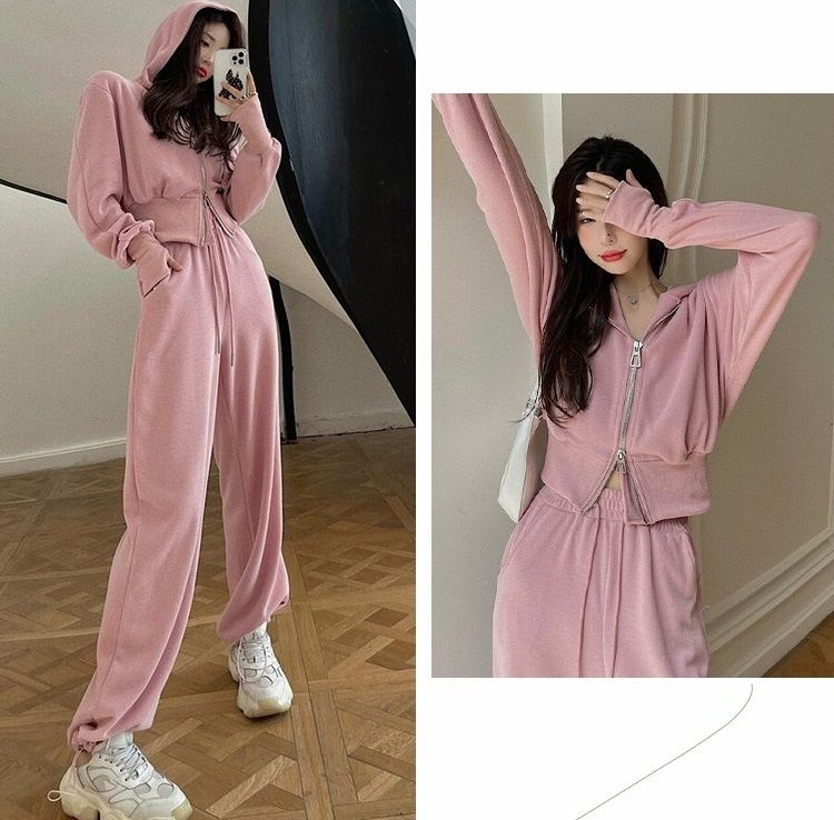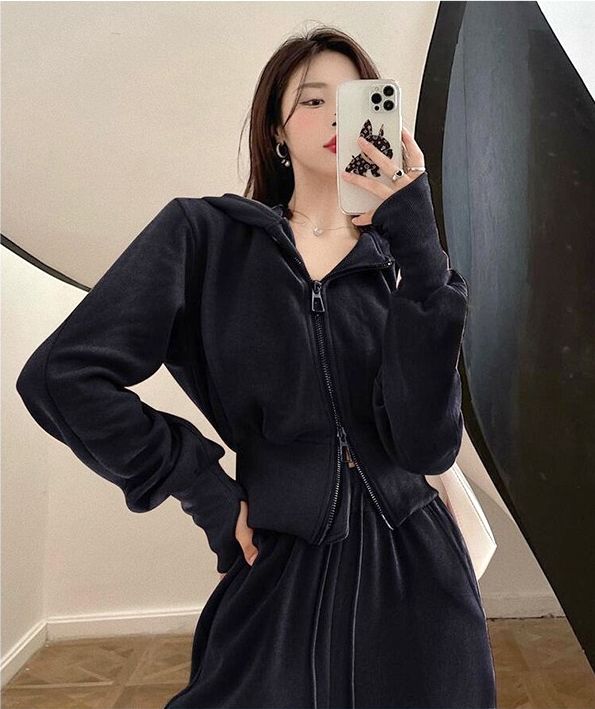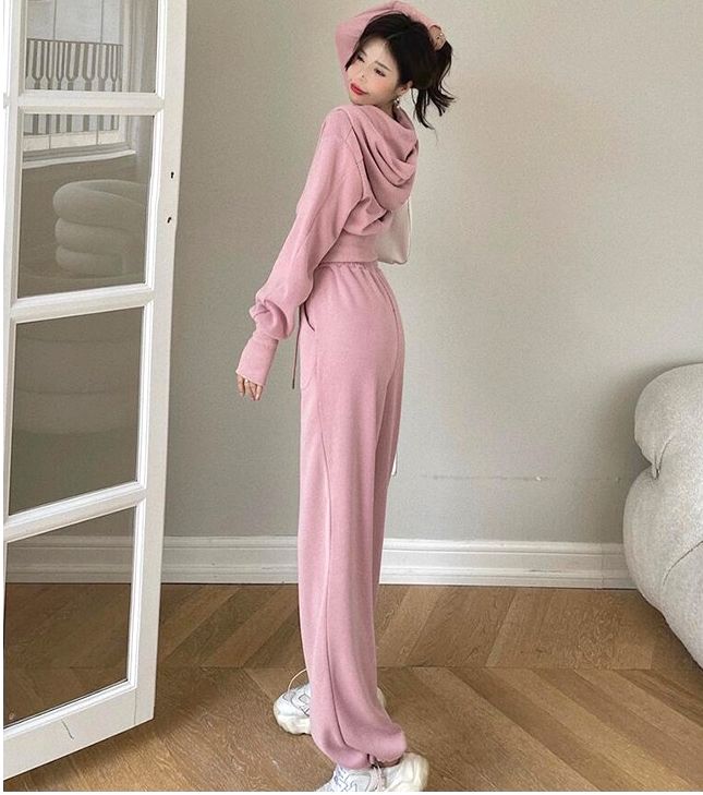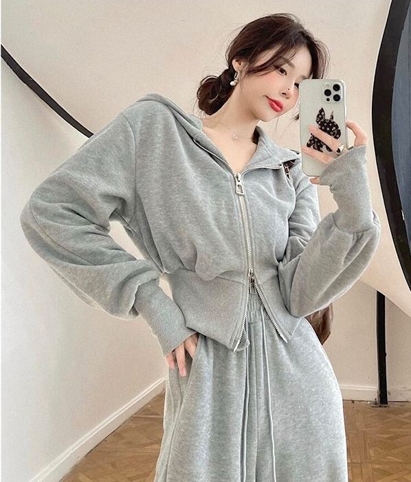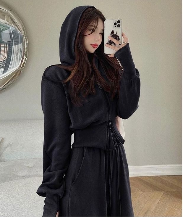 時尚連帽拉鍊外套+運動長褲兩件式套裝