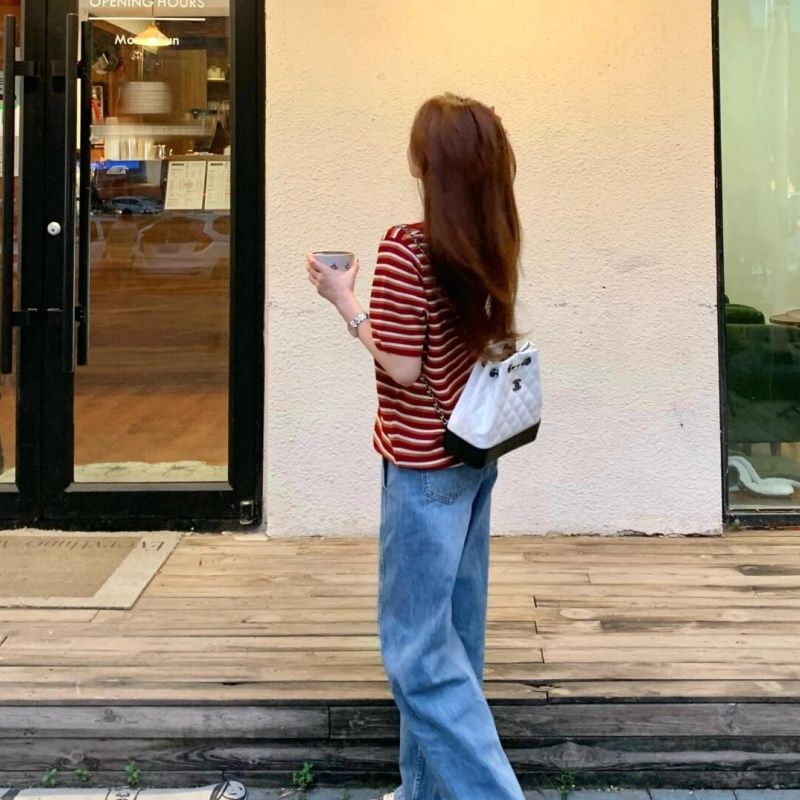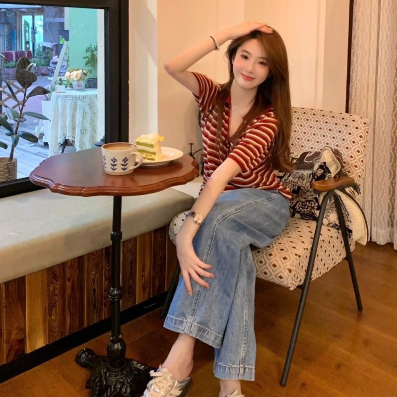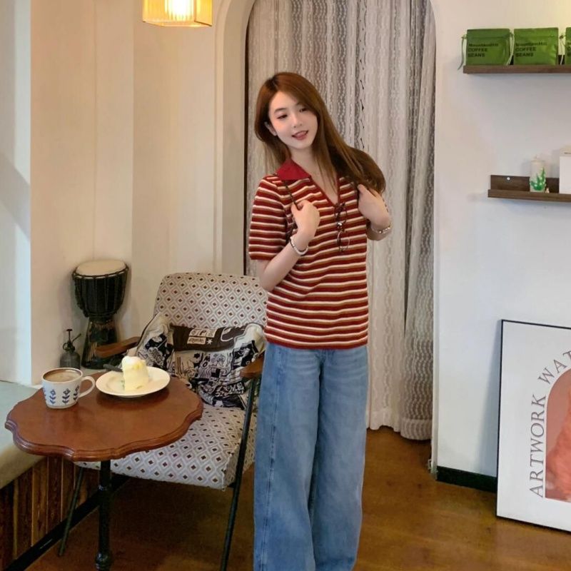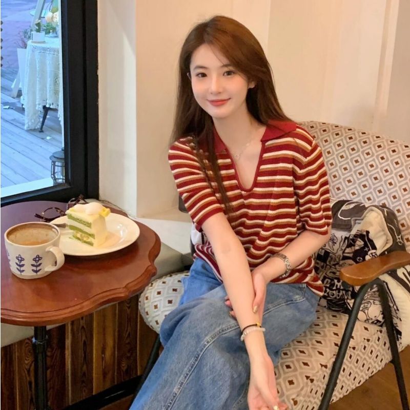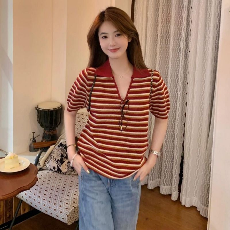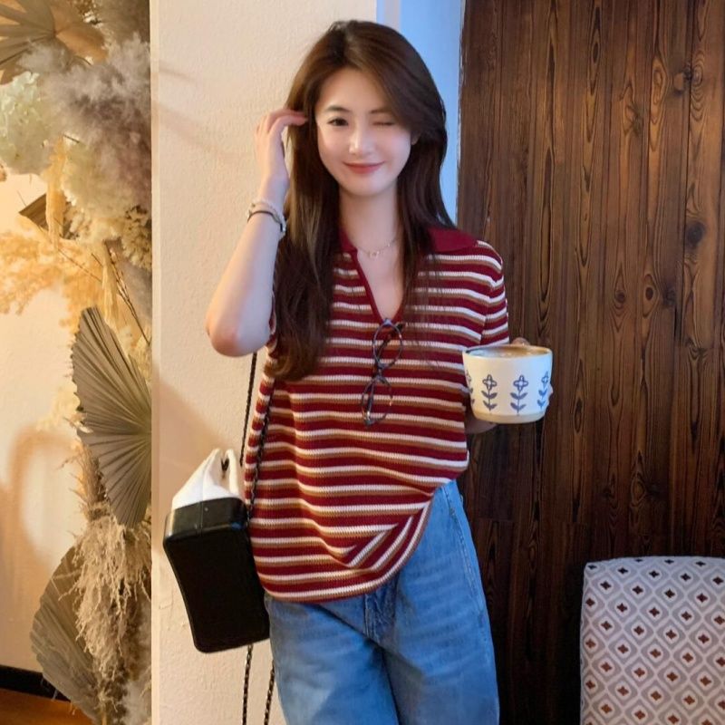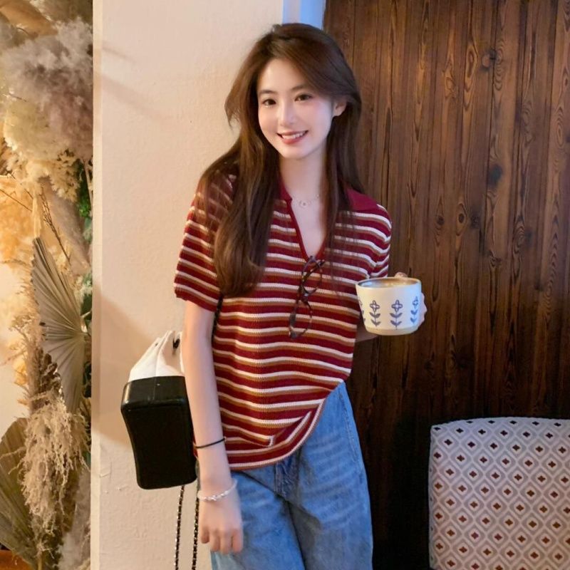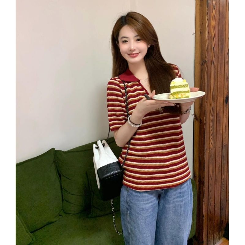 條紋鏤空冰絲針織短袖T恤(預購)pn003002