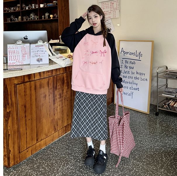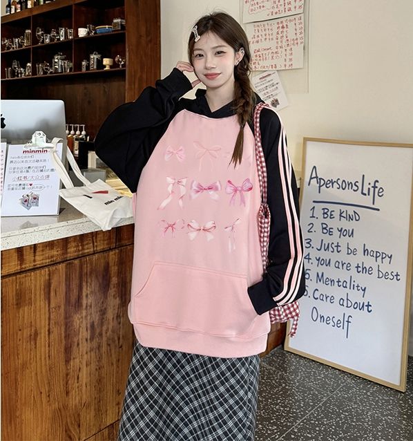 蝴蝶結拼色三槓印花連帽長袖T恤