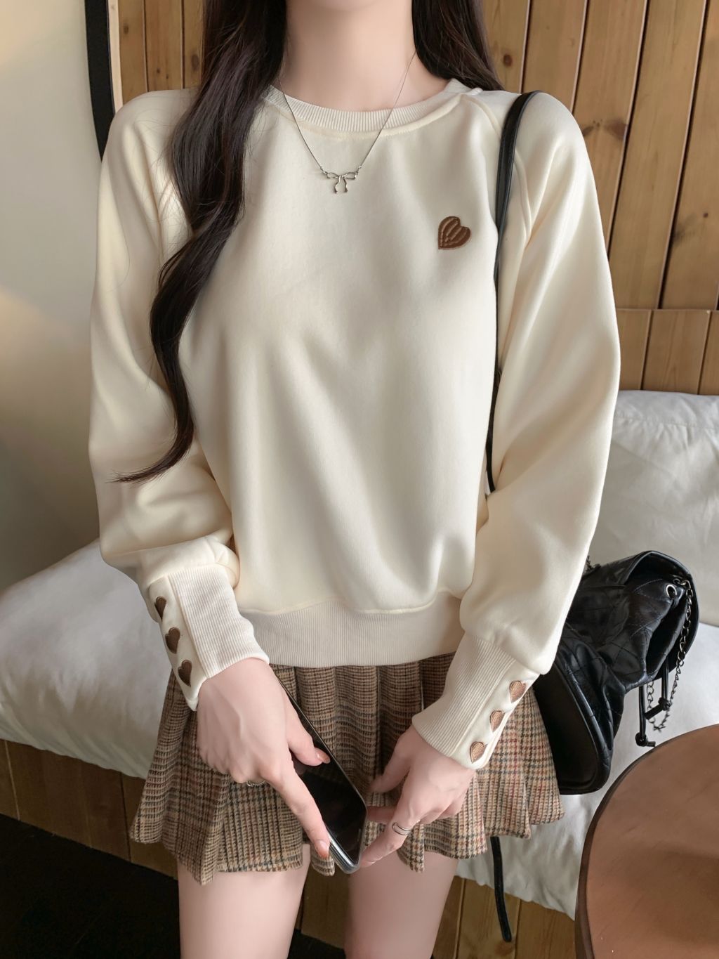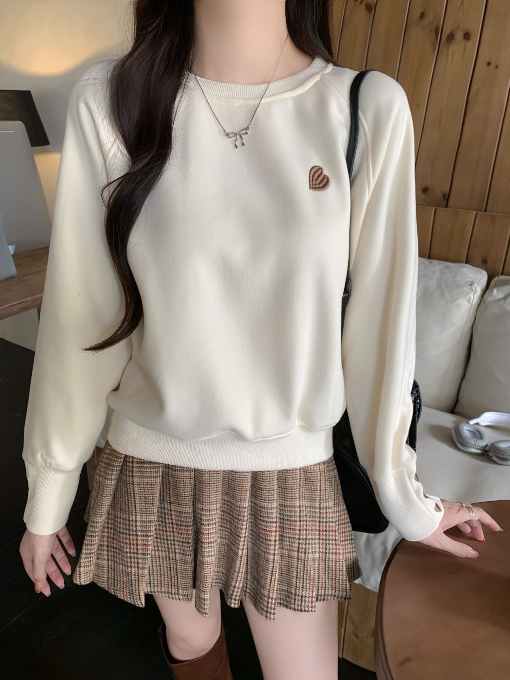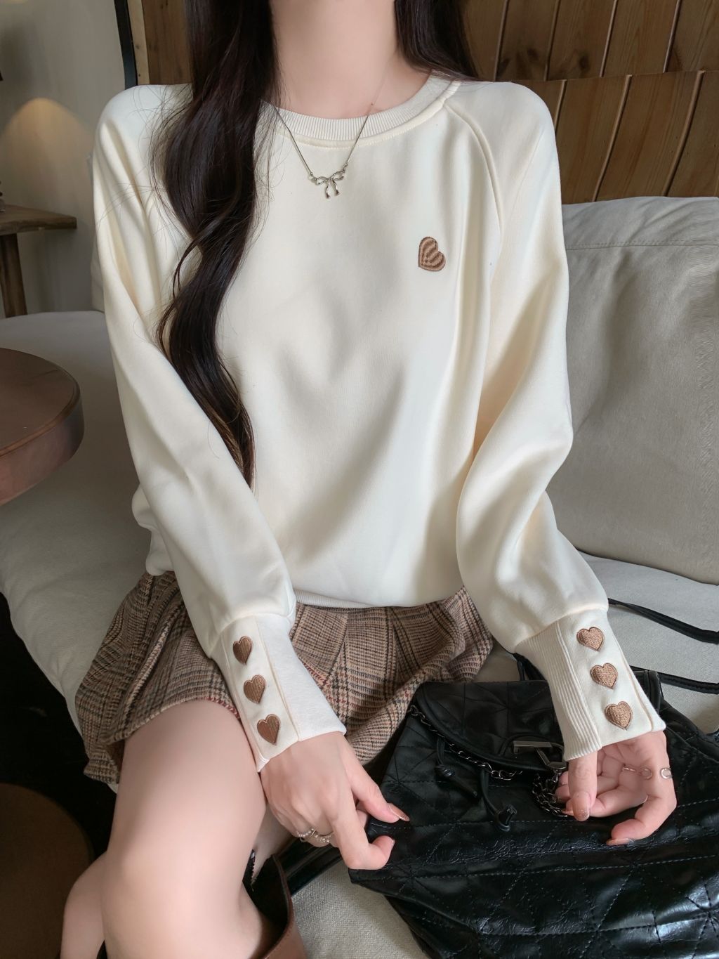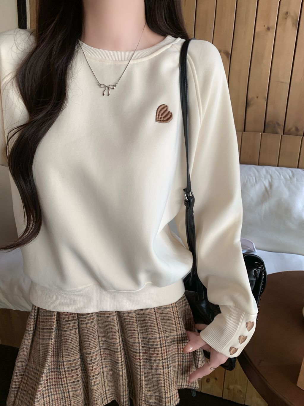 加絨加厚美式圓領刺繡愛心長袖T恤