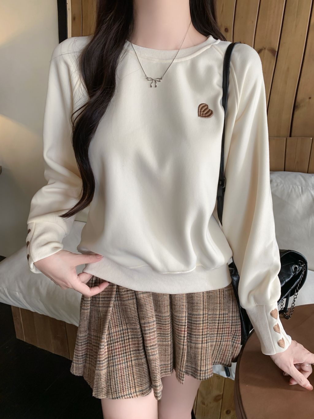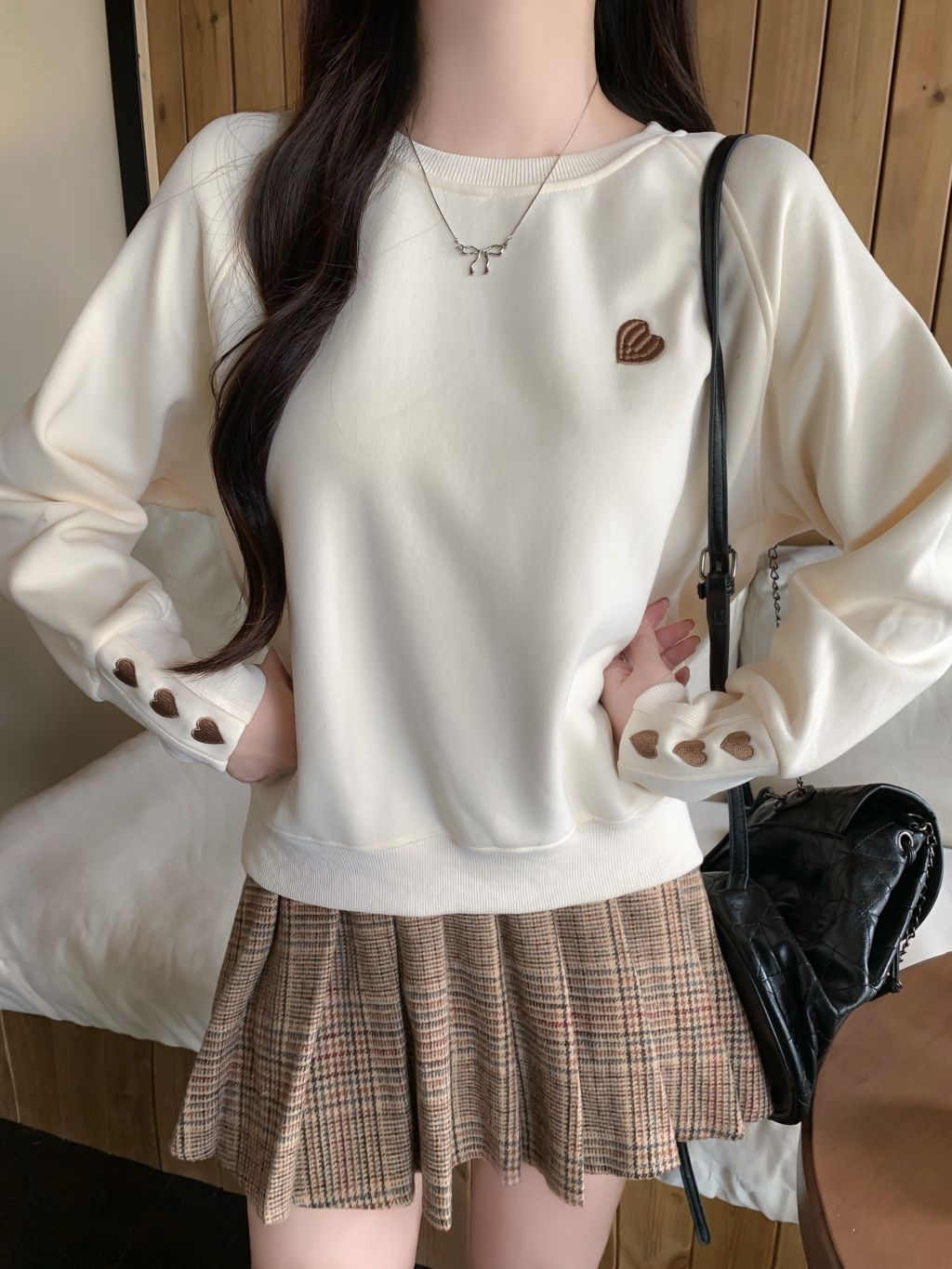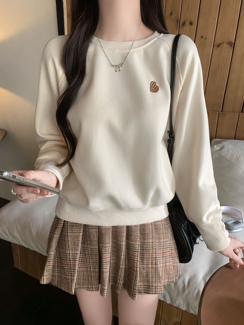 加絨加厚美式圓領刺繡愛心長袖T恤
