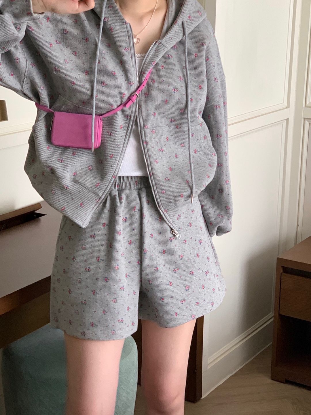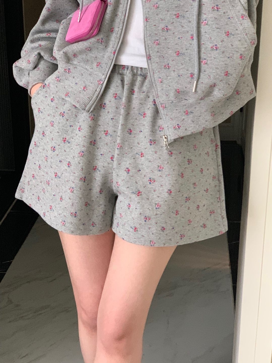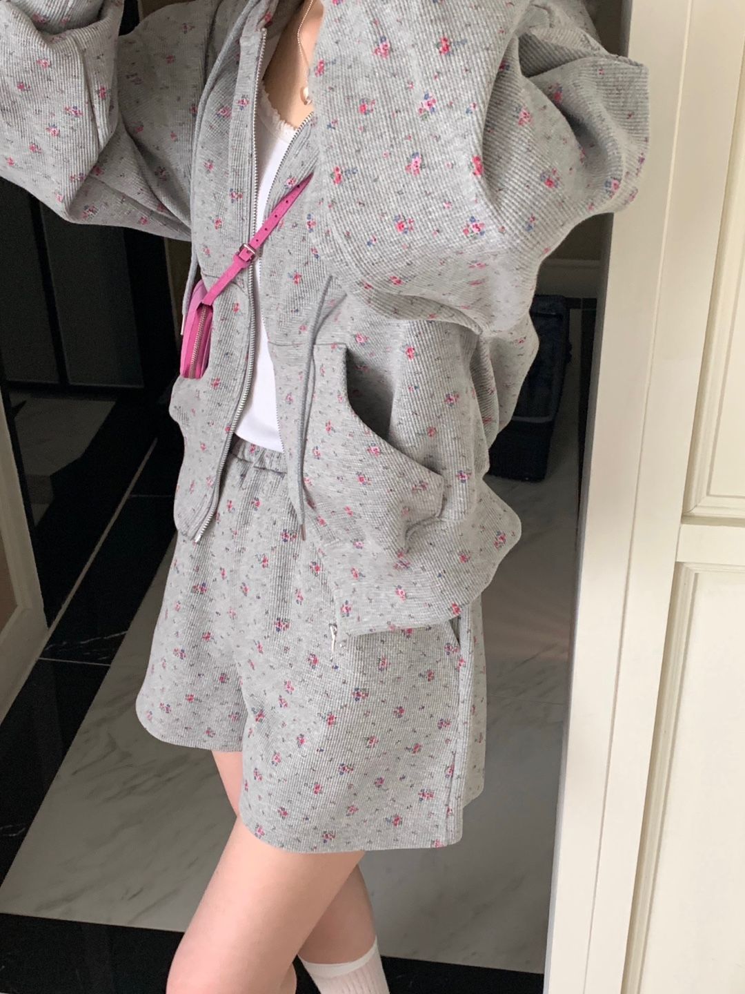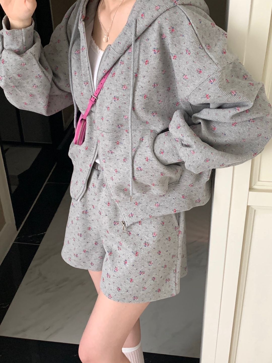 韓式碎花連帽長袖運動外套+高腰闊腿短褲兩件套