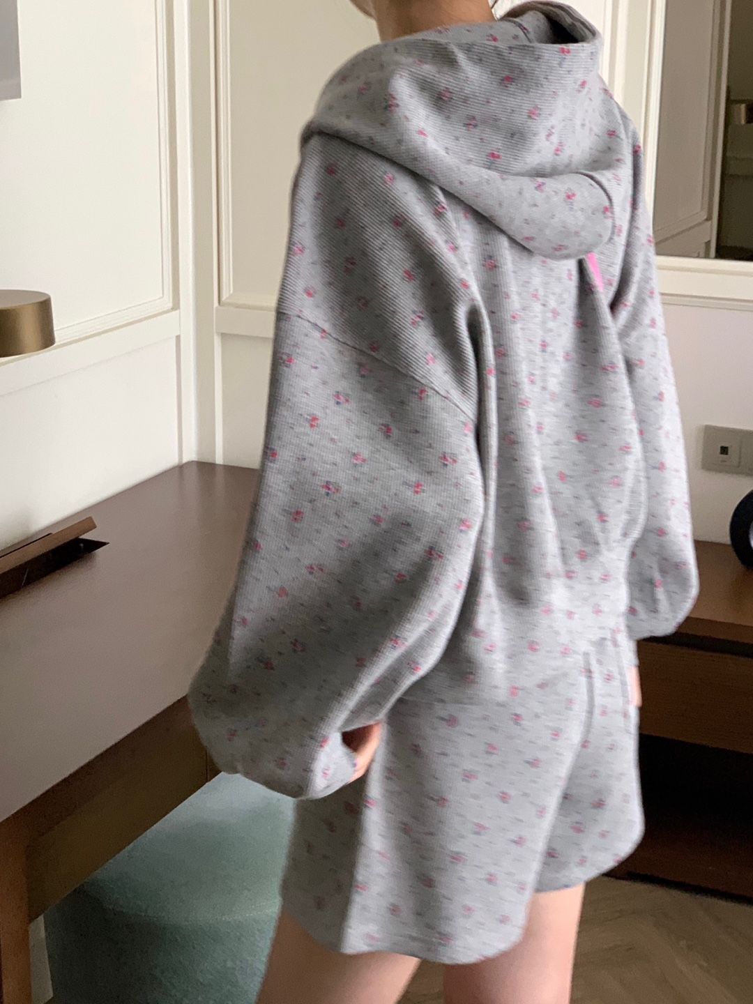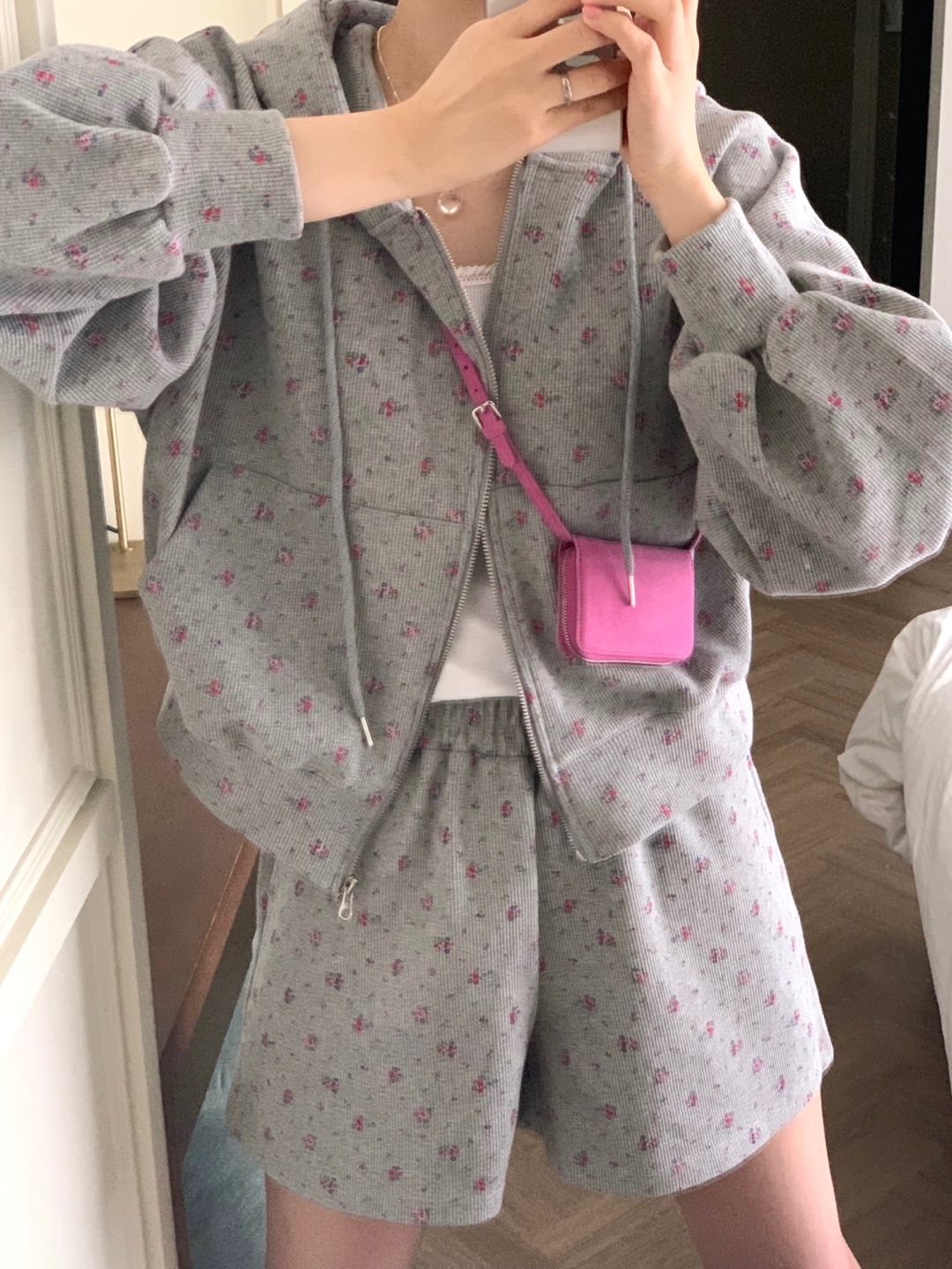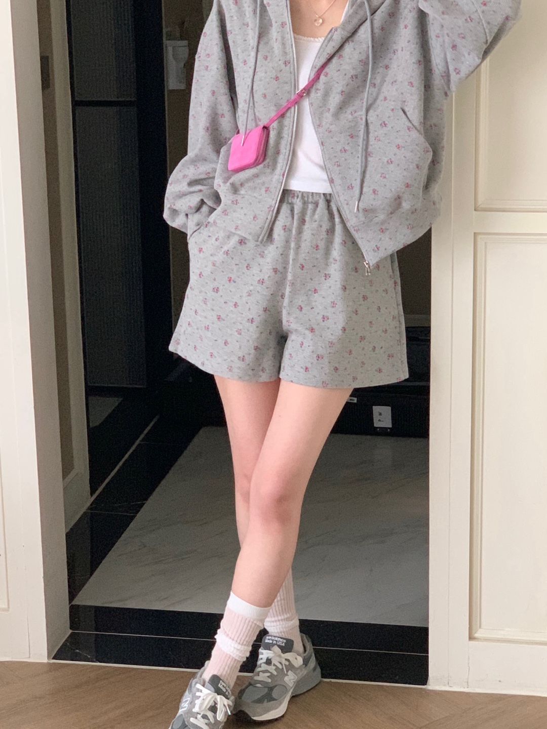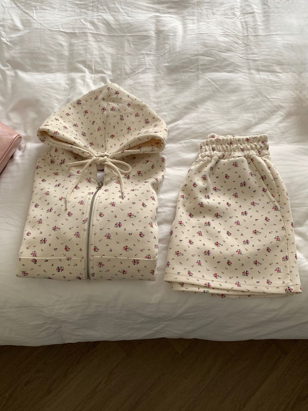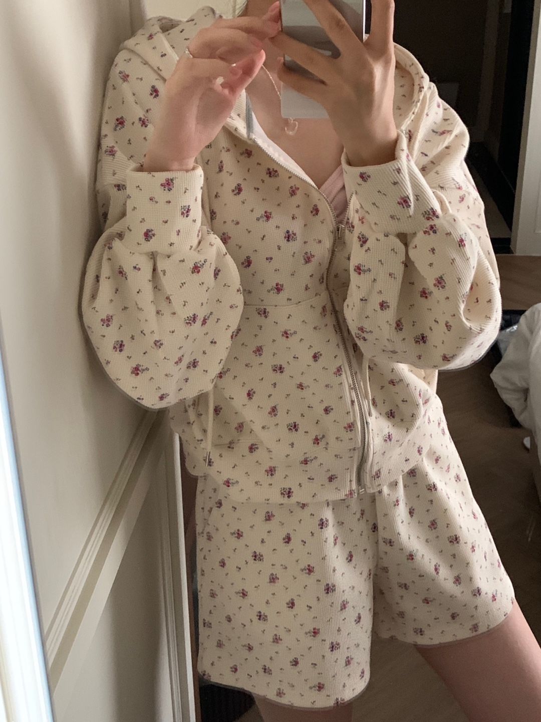 韓式碎花連帽長袖運動外套+高腰闊腿短褲兩件套