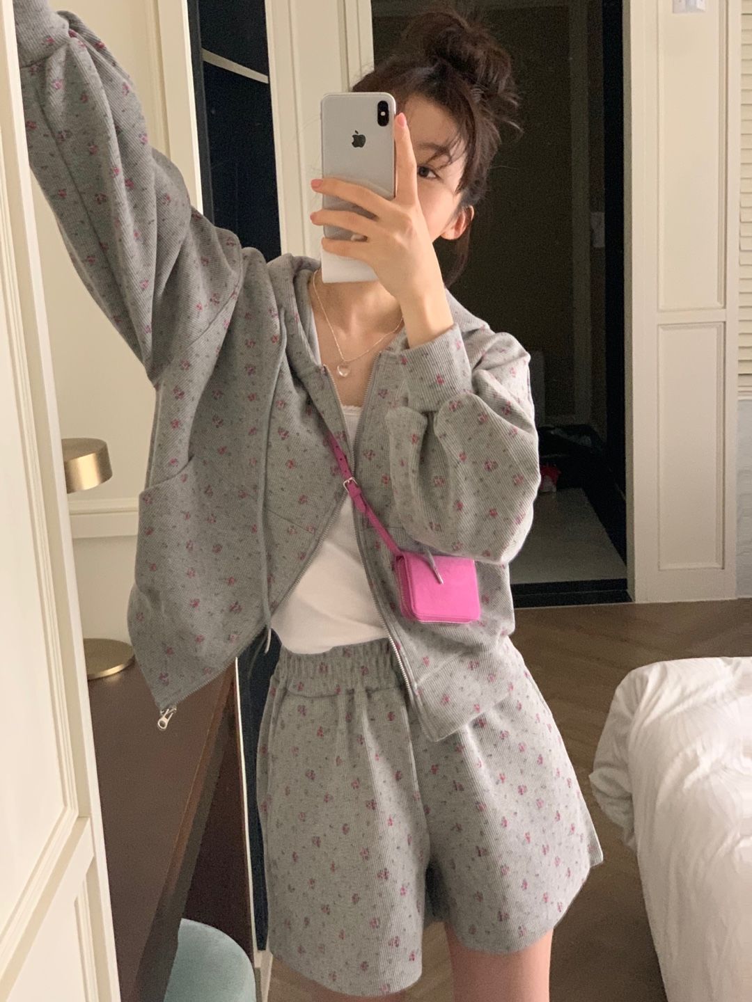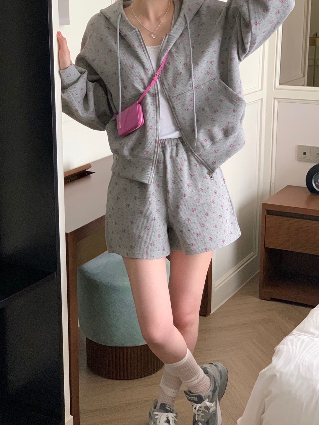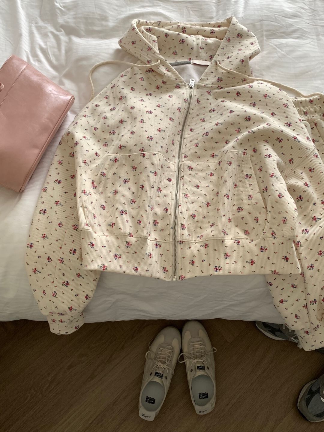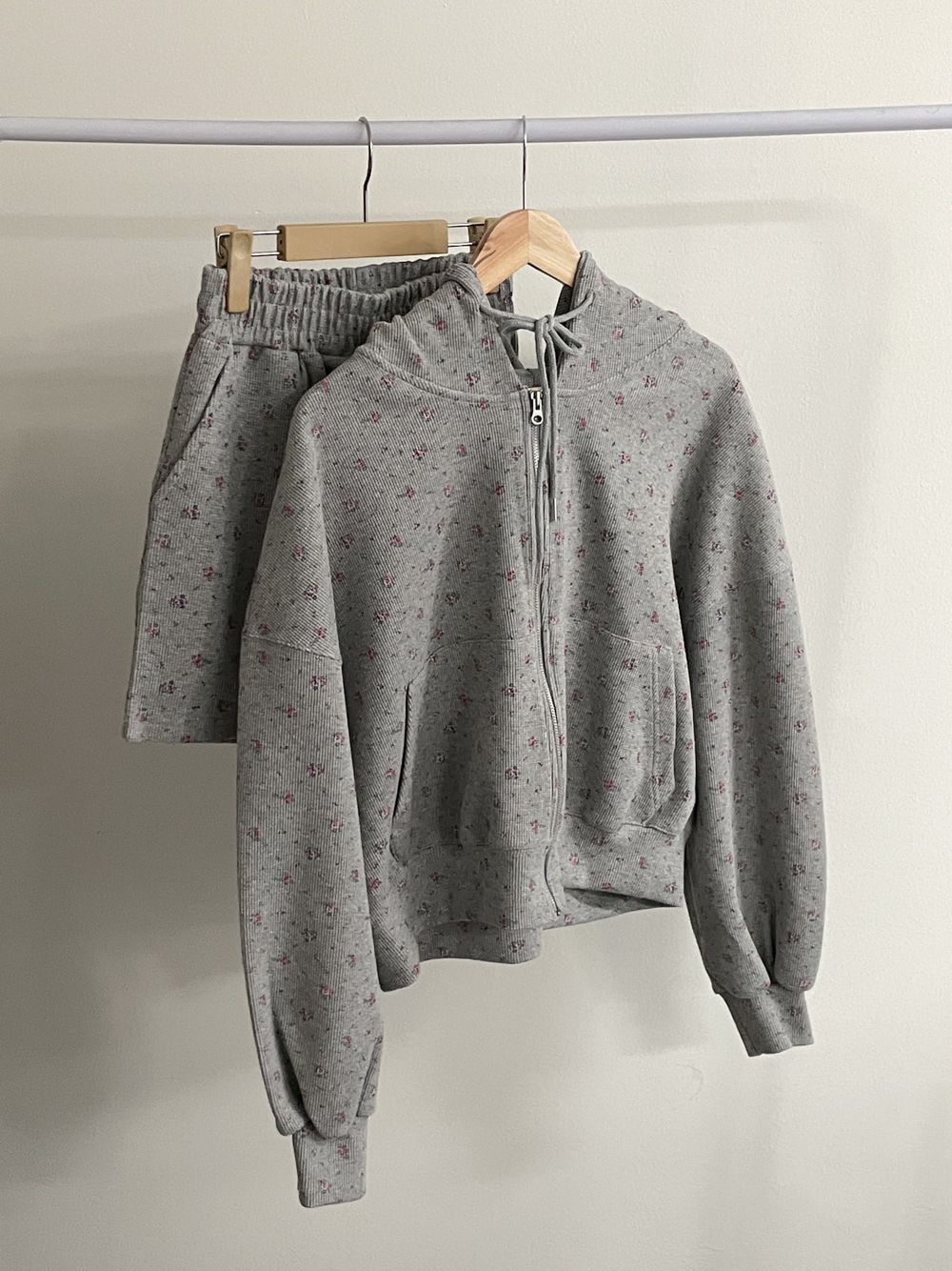 韓式碎花連帽長袖運動外套+高腰闊腿短褲兩件套
