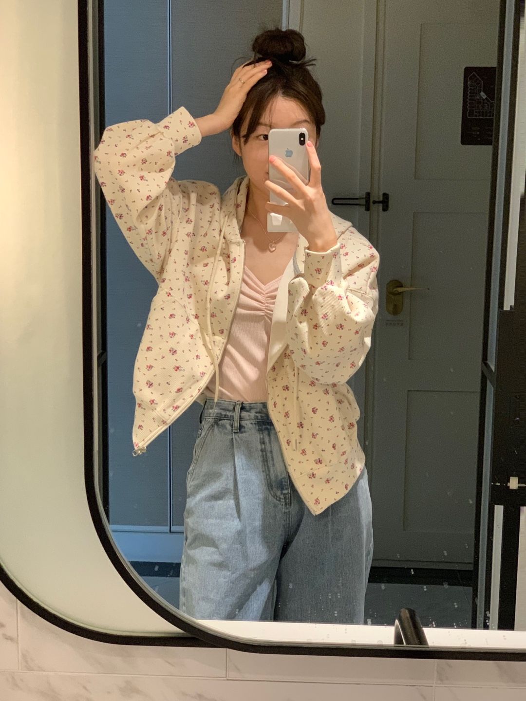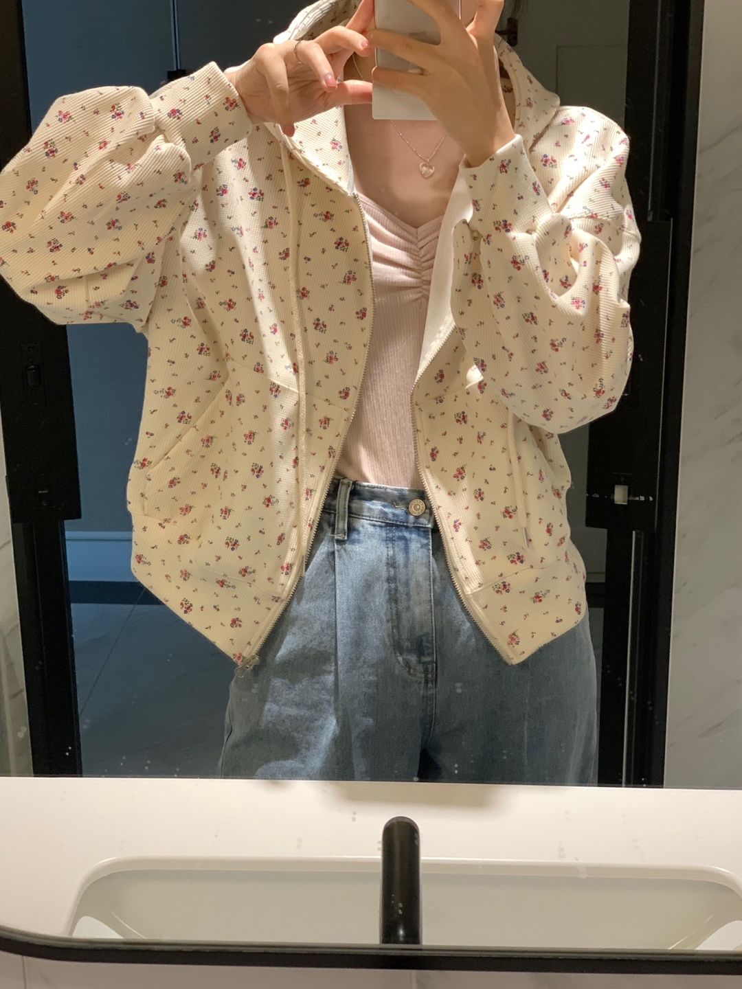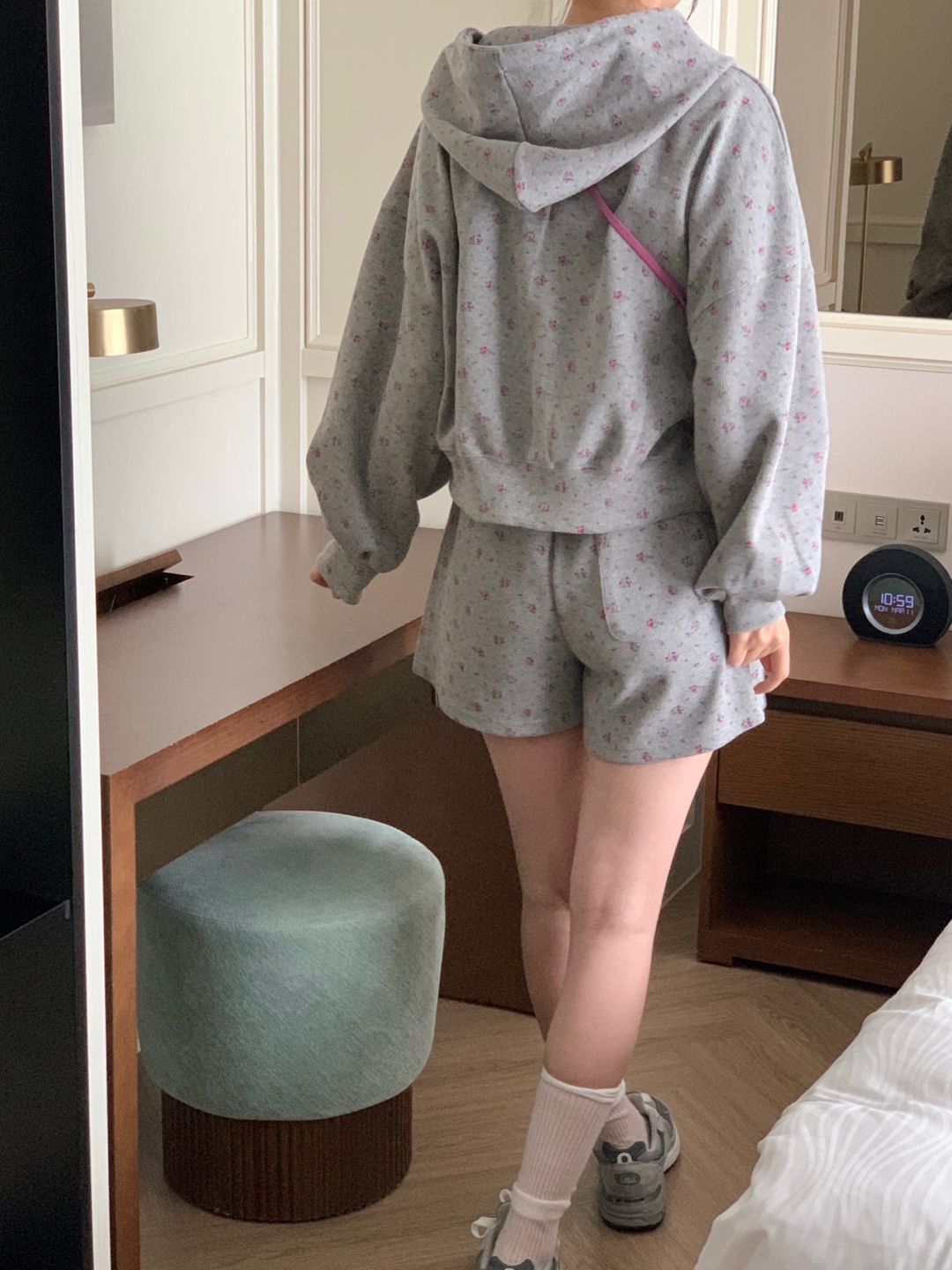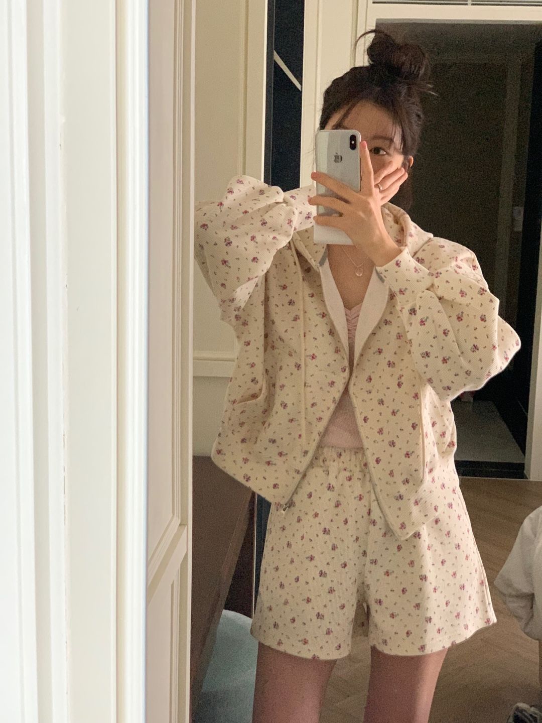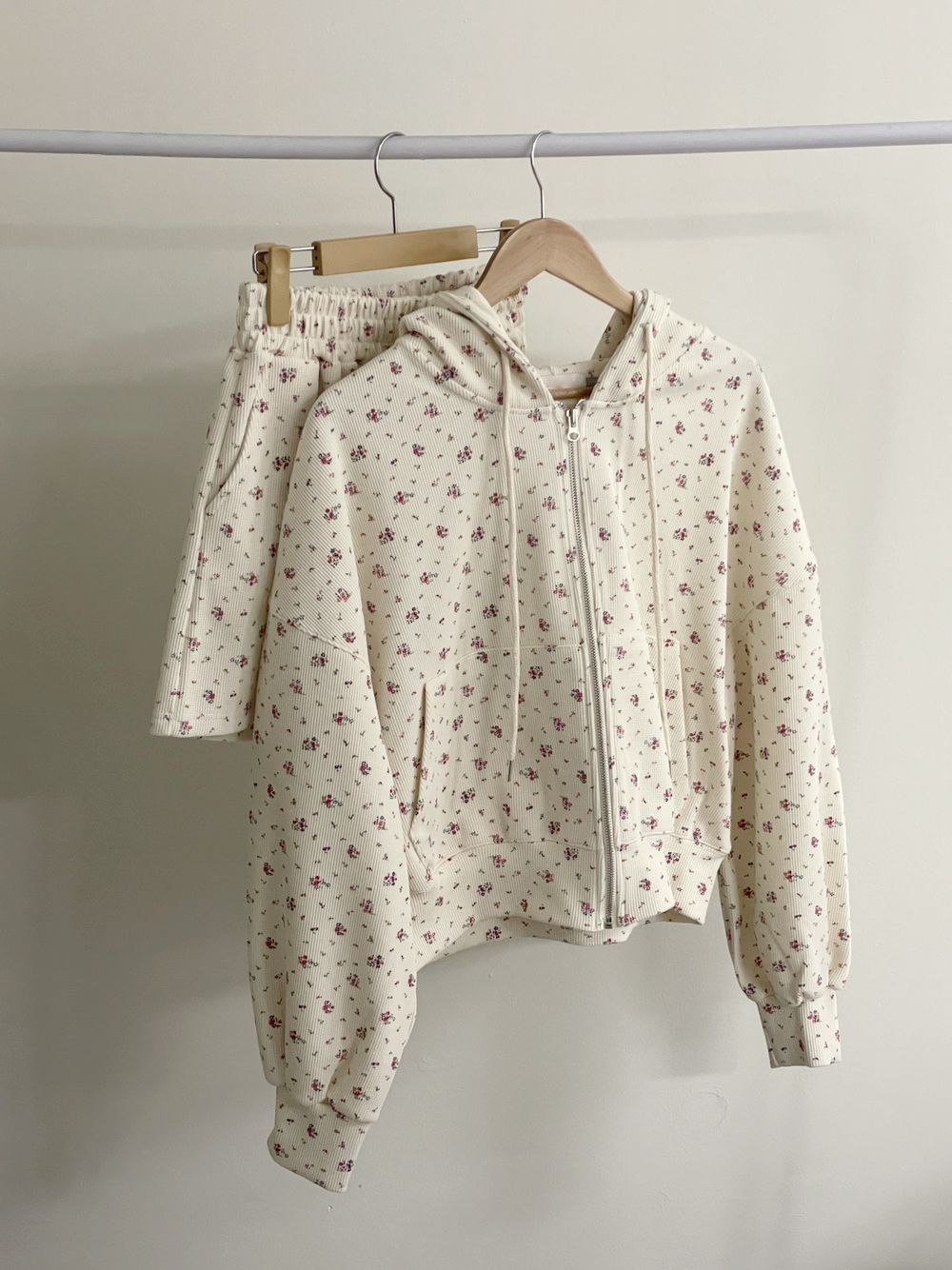 韓式碎花連帽長袖運動外套+高腰闊腿短褲兩件套
