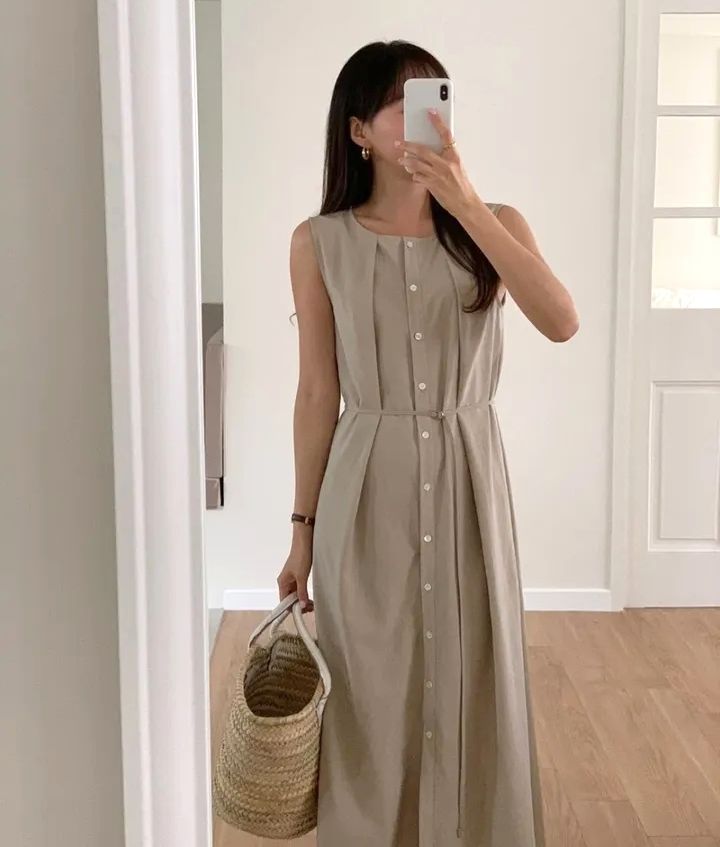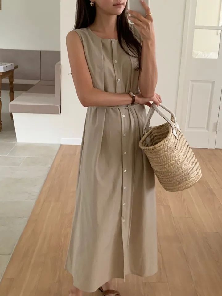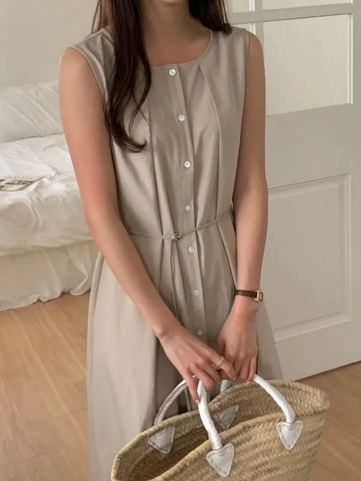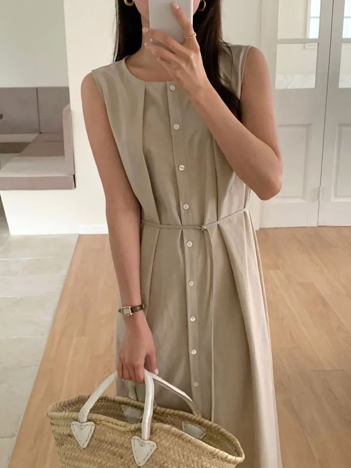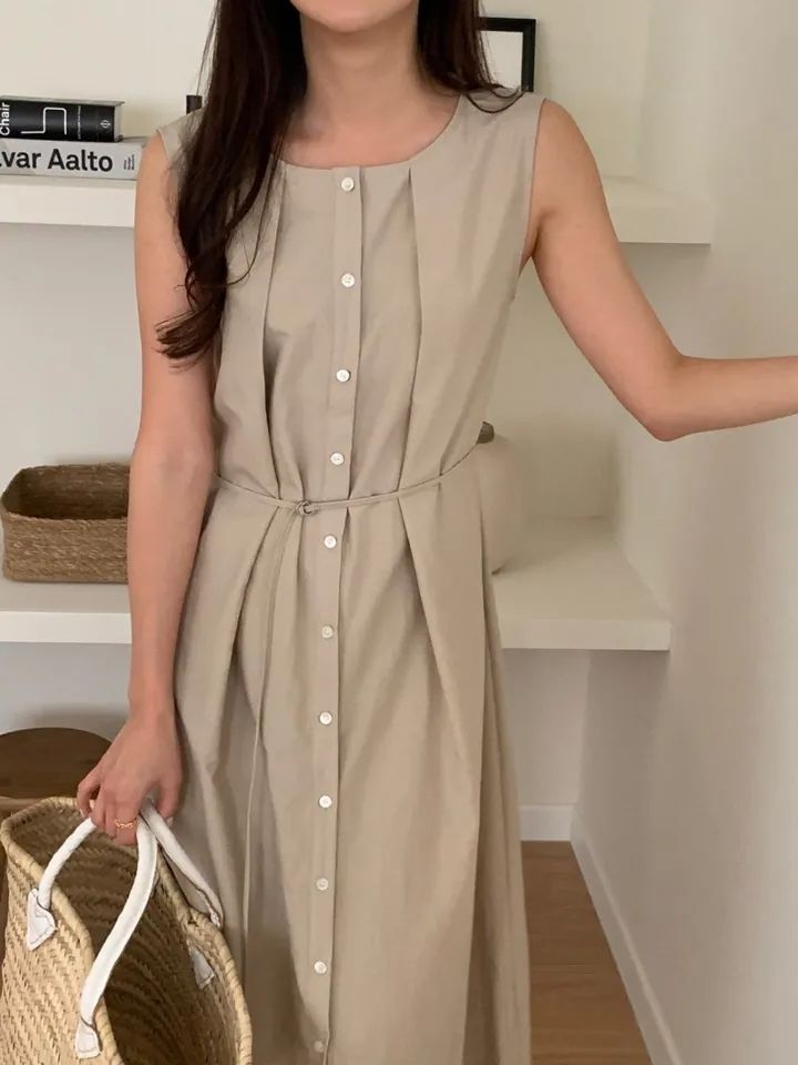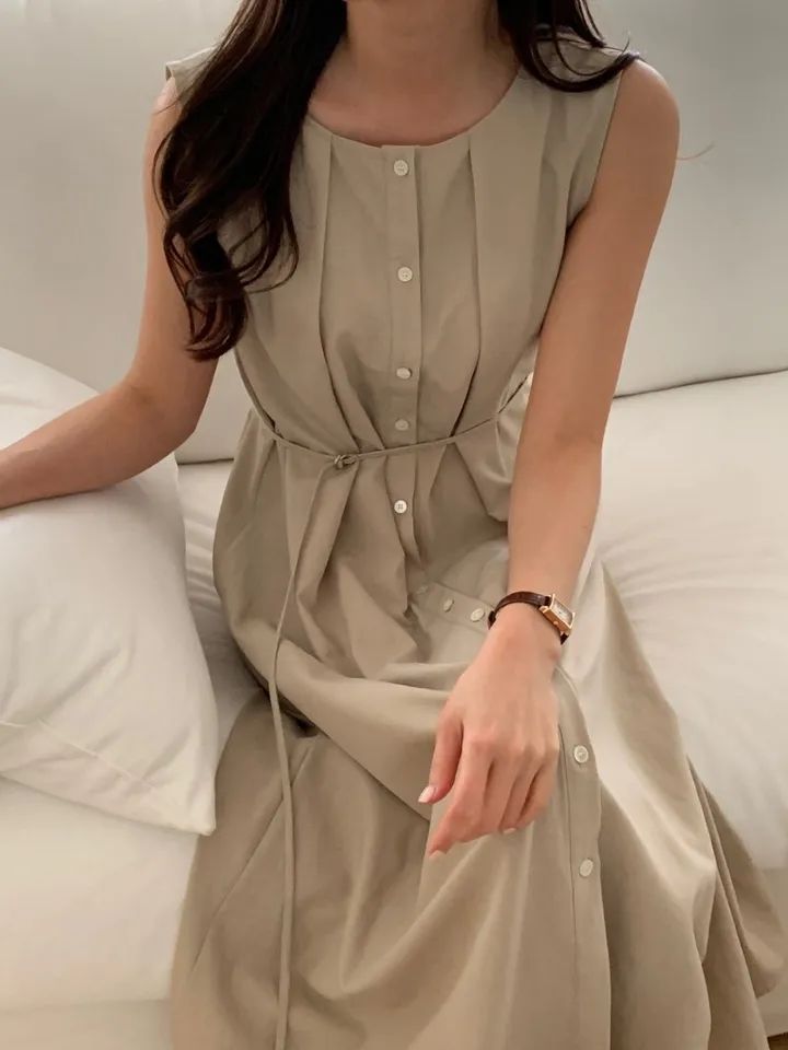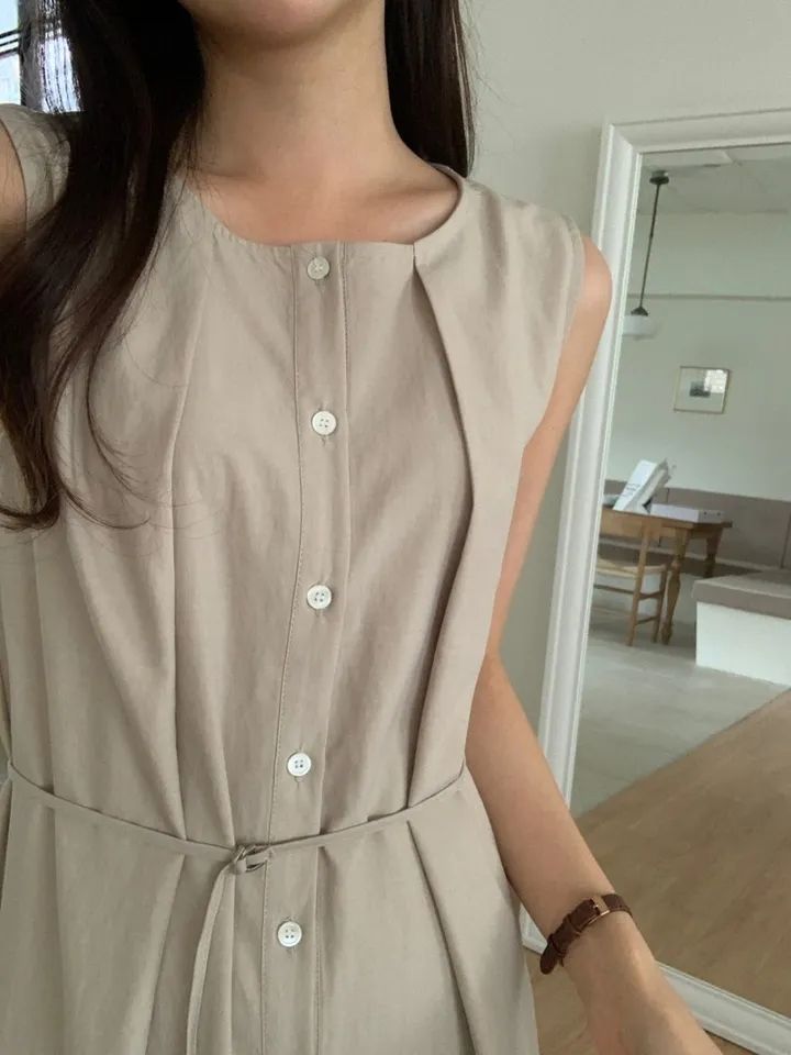 簡約細褶單排扣繫帶無袖背心裙洋裝