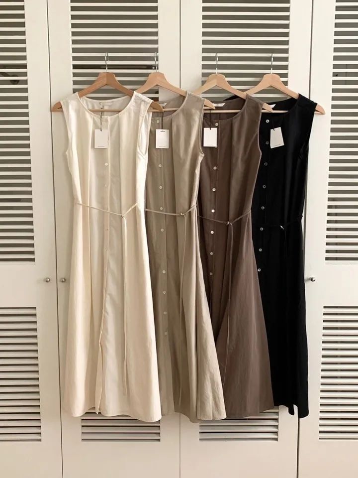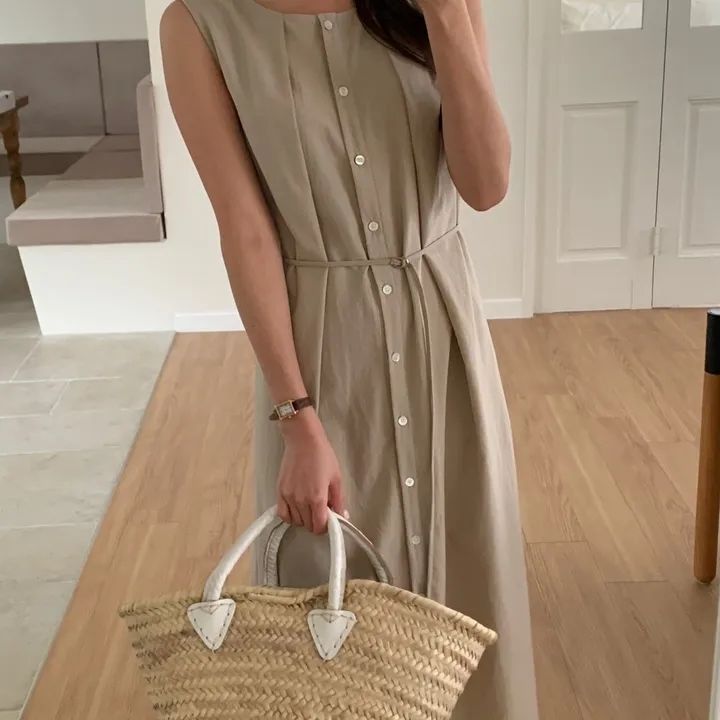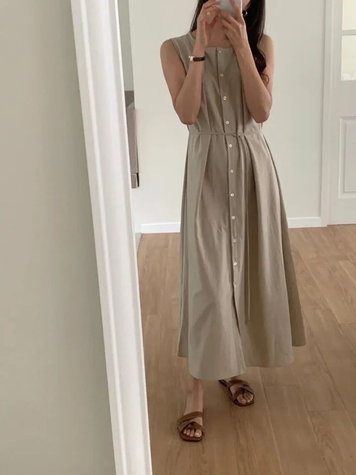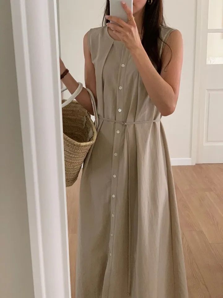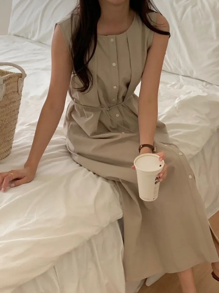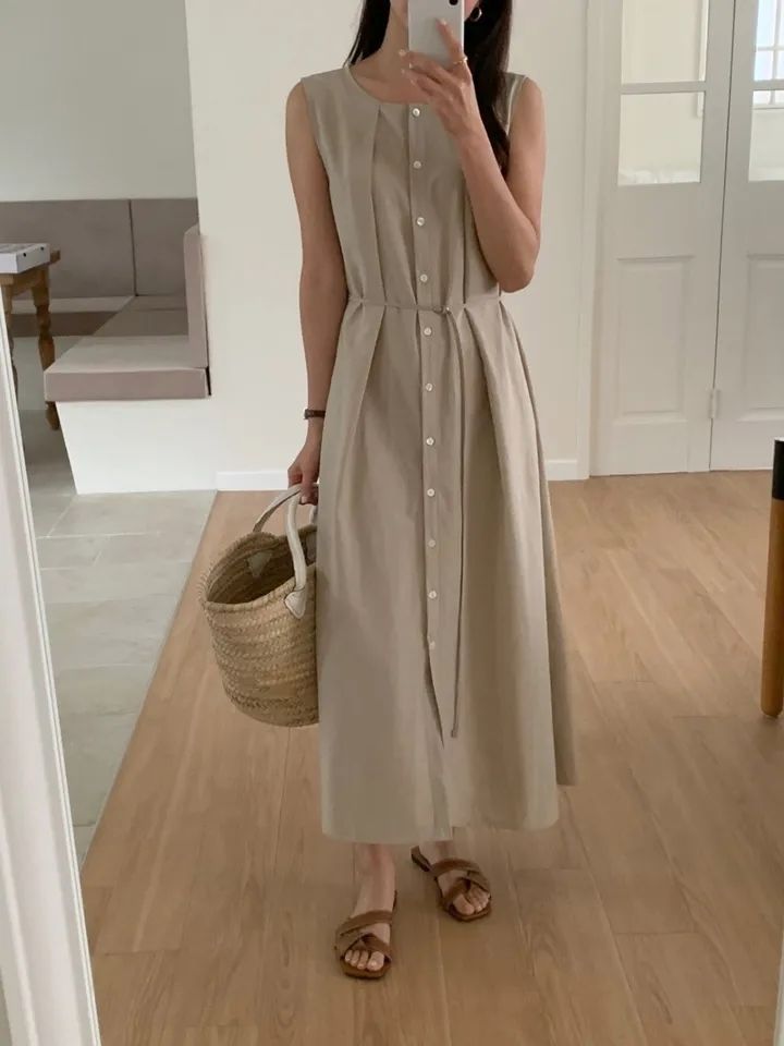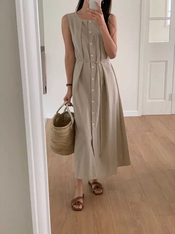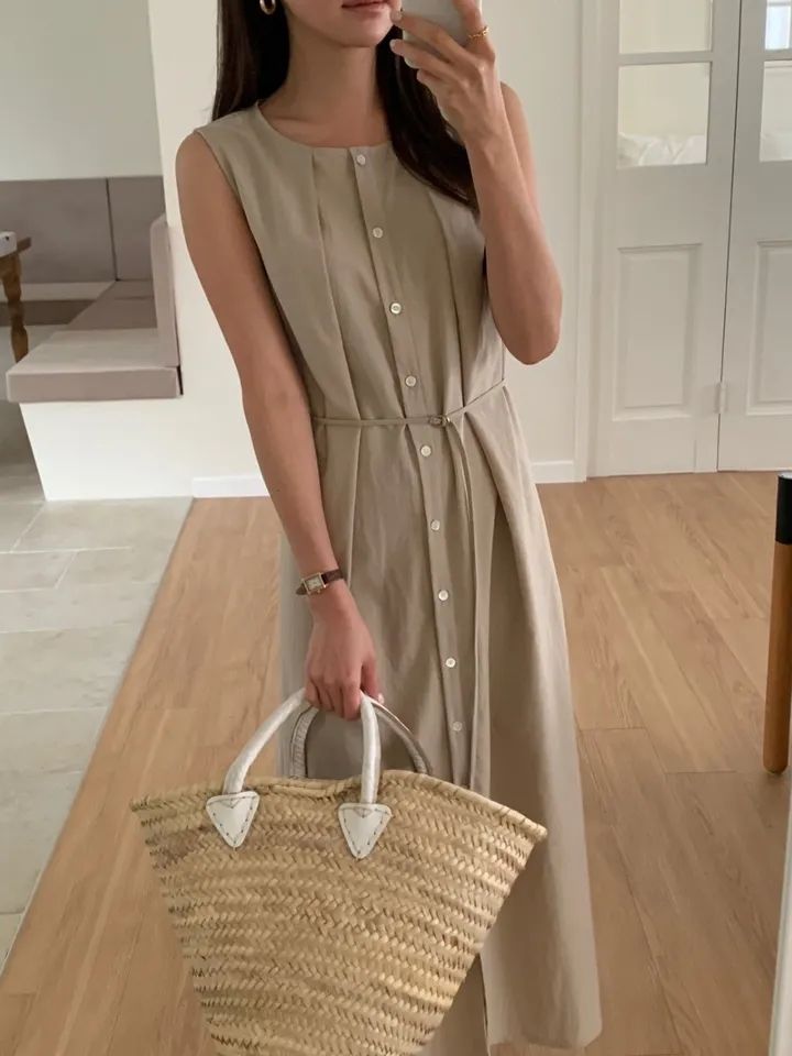 簡約細褶單排扣繫帶無袖背心裙洋裝