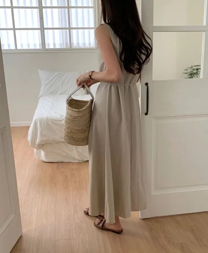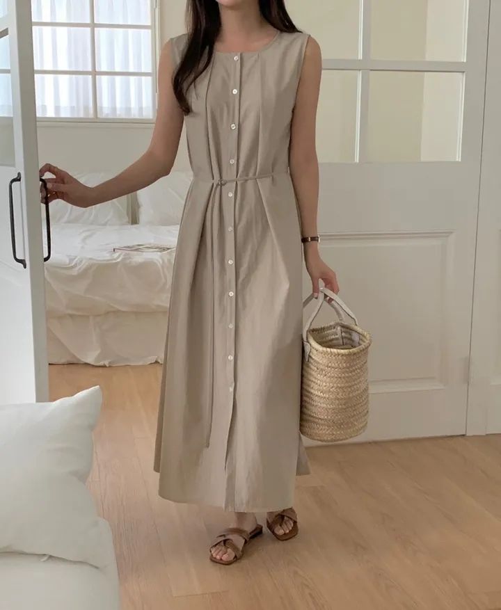 簡約細褶單排扣繫帶無袖背心裙洋裝(預購)vic005309