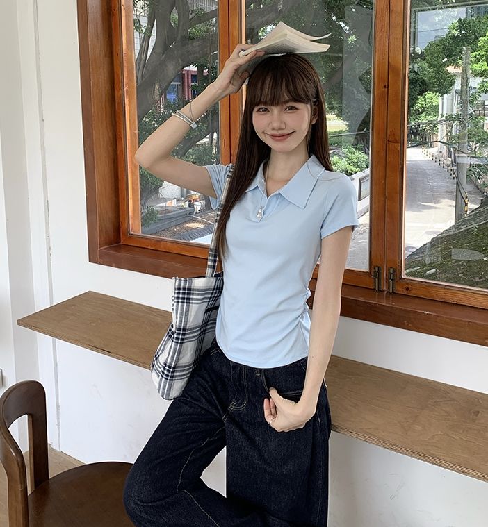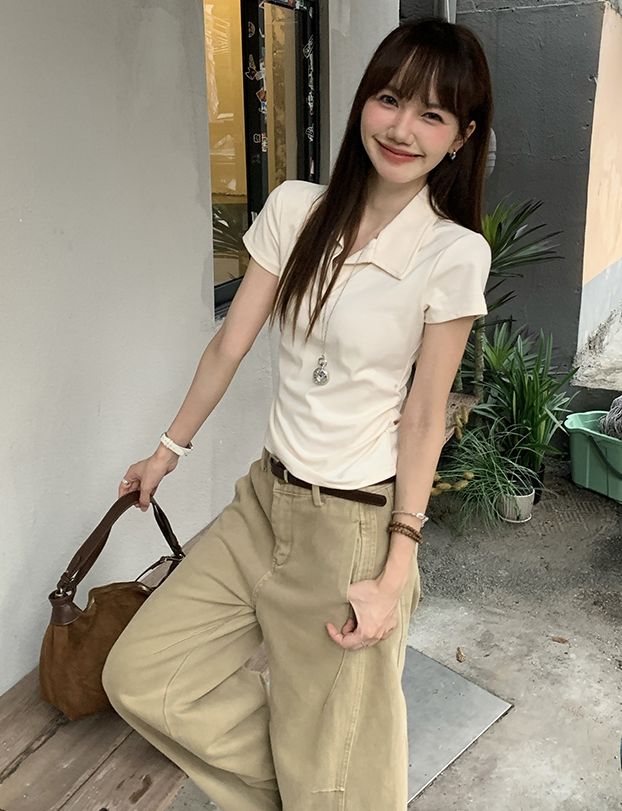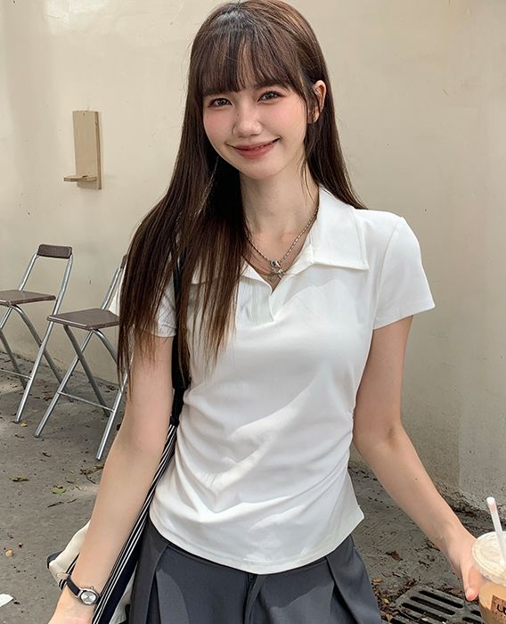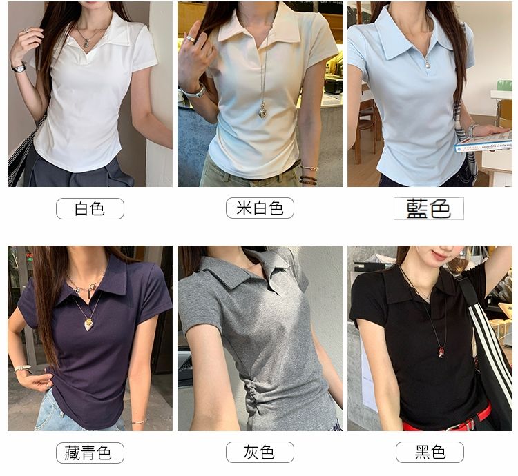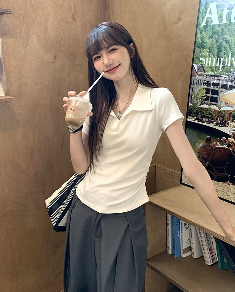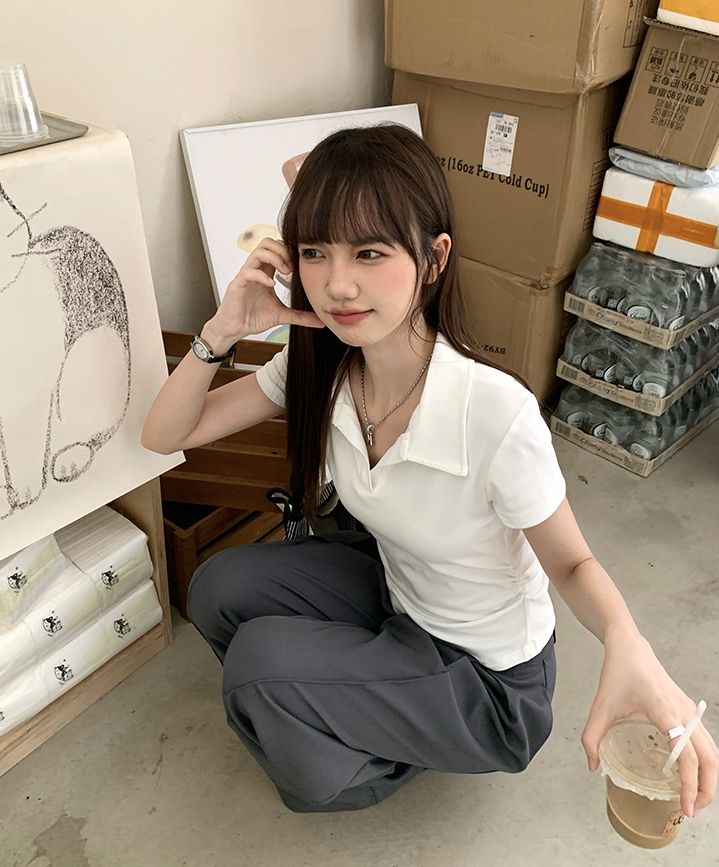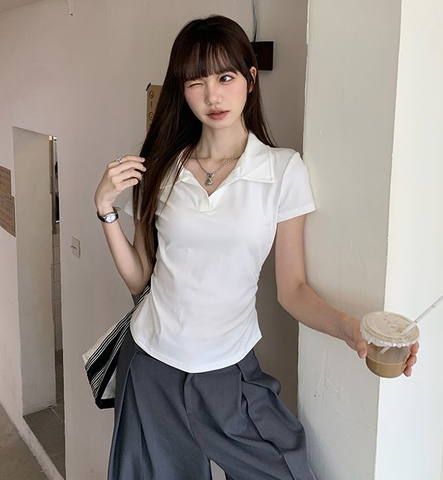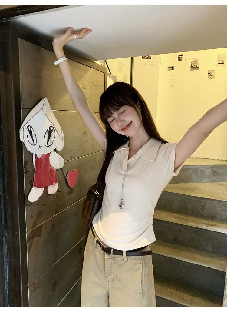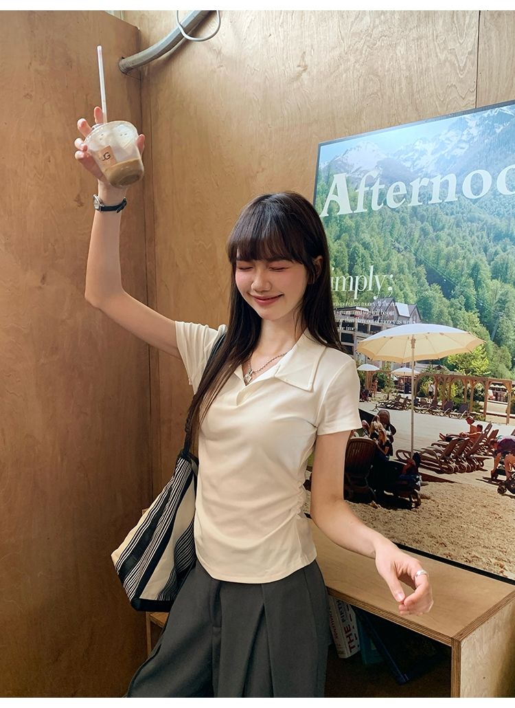 翻領純色褶皺收腰短袖T恤(預購)vic005423