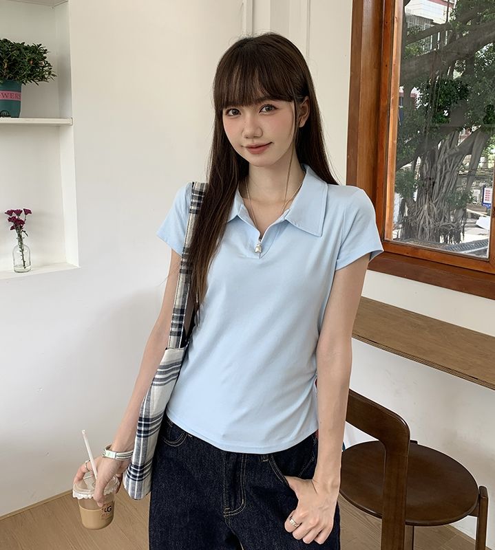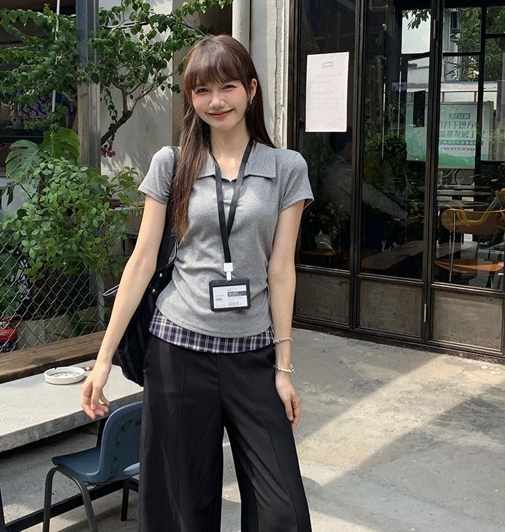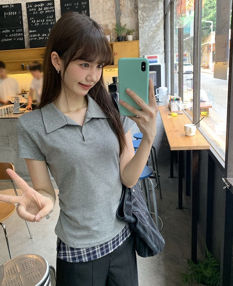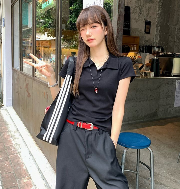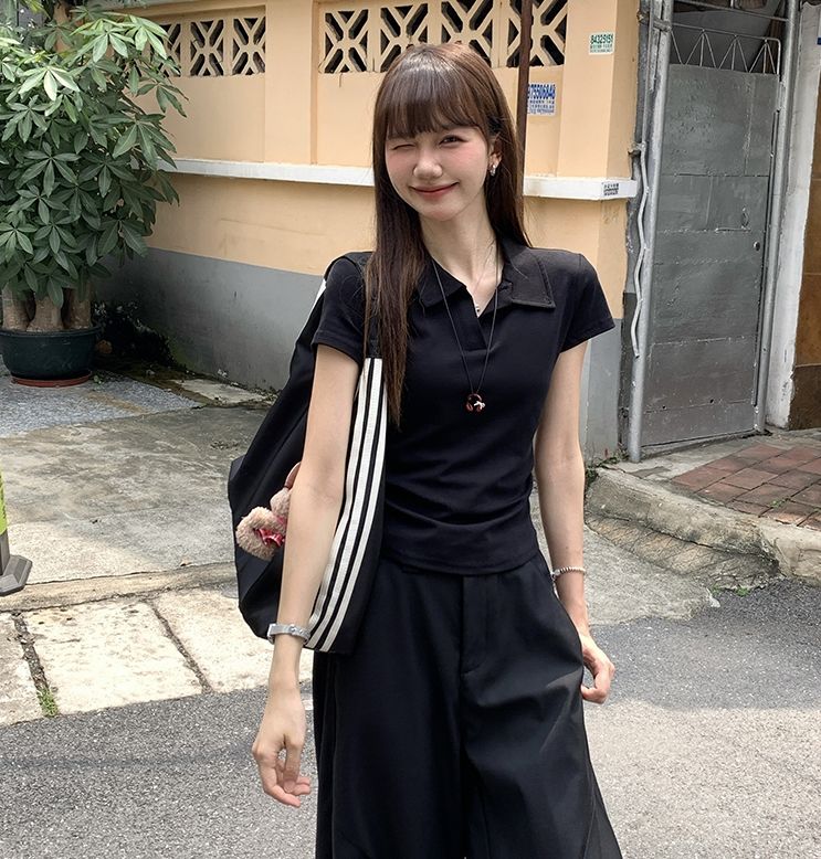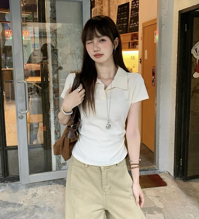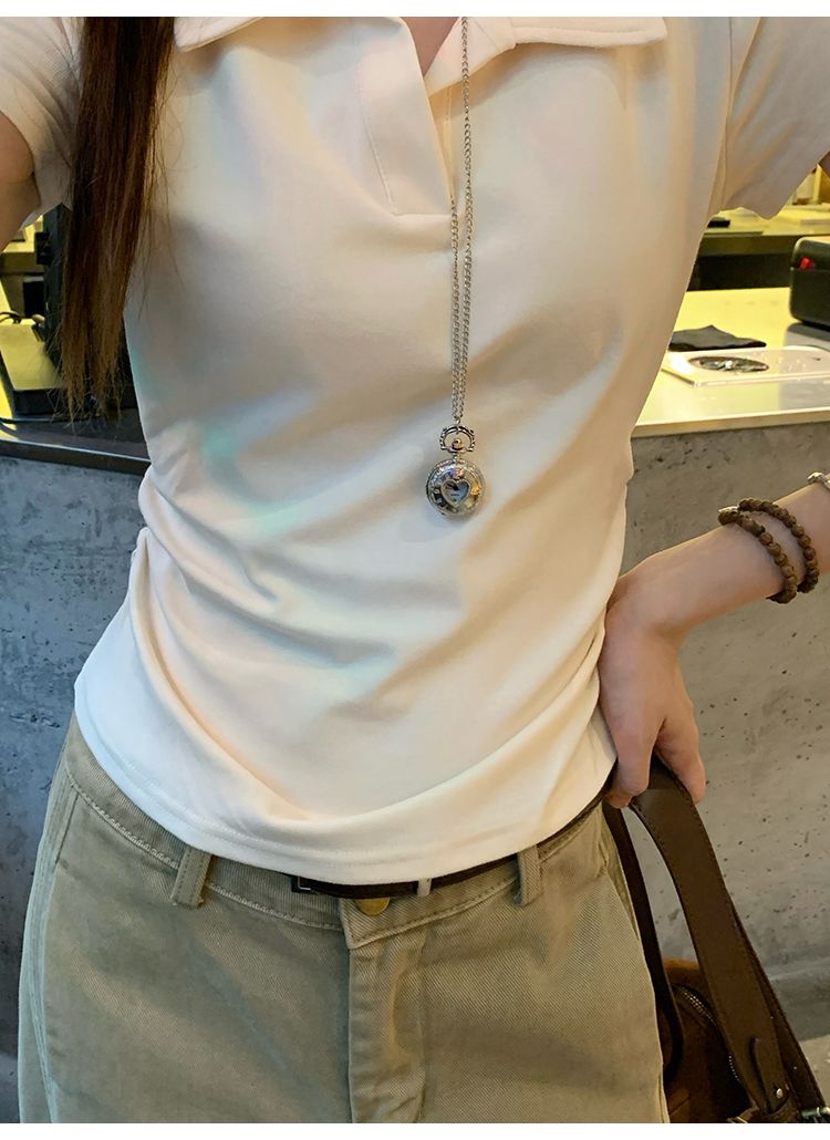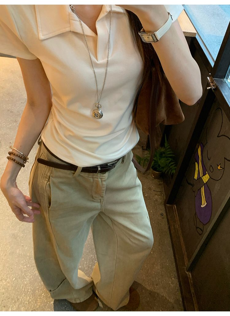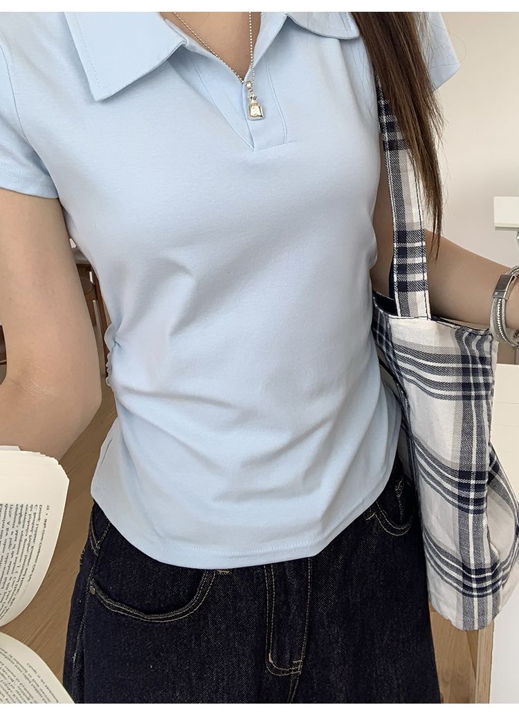 翻領純色褶皺收腰短袖T恤(預購)vic005423
