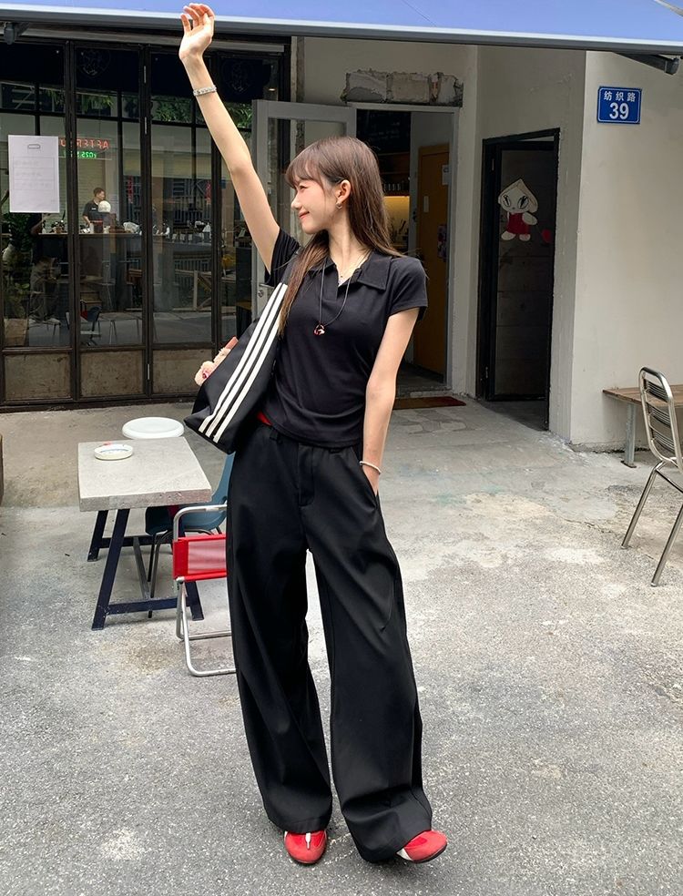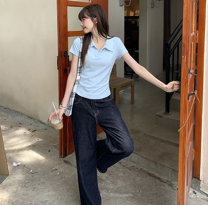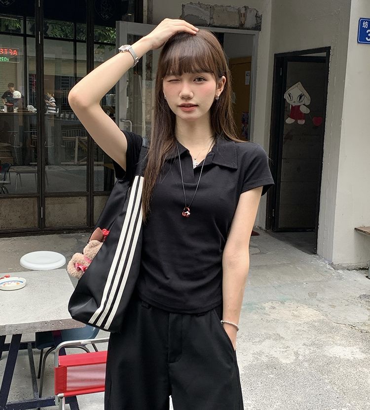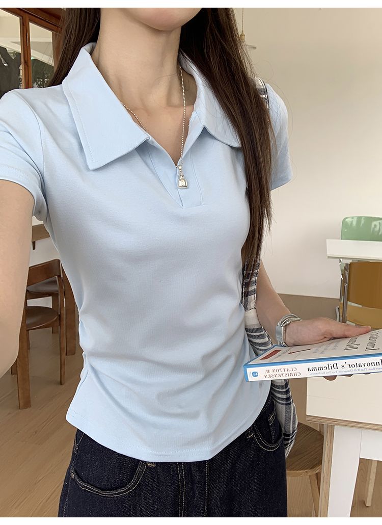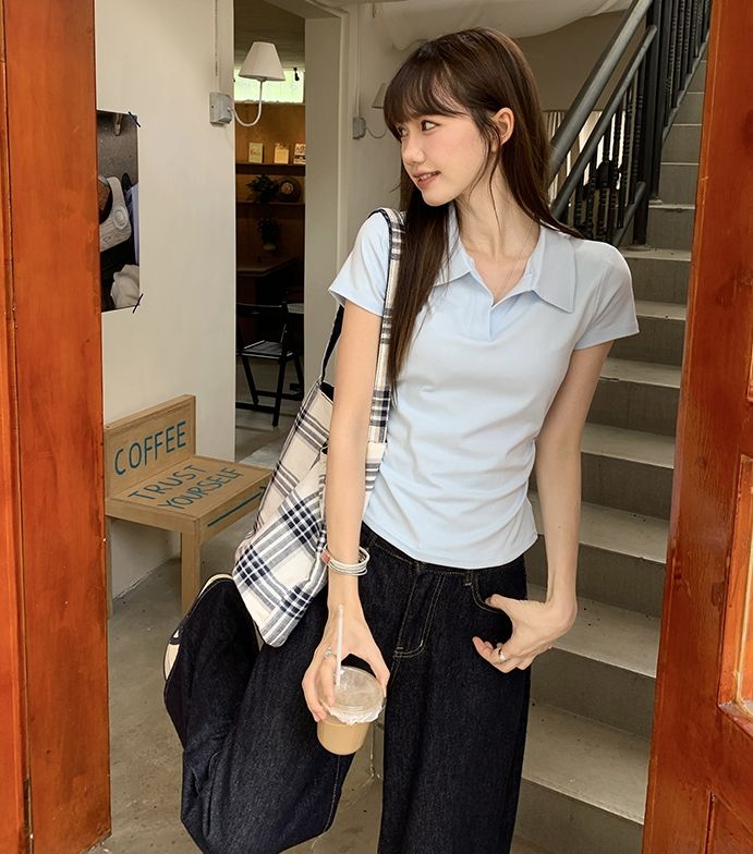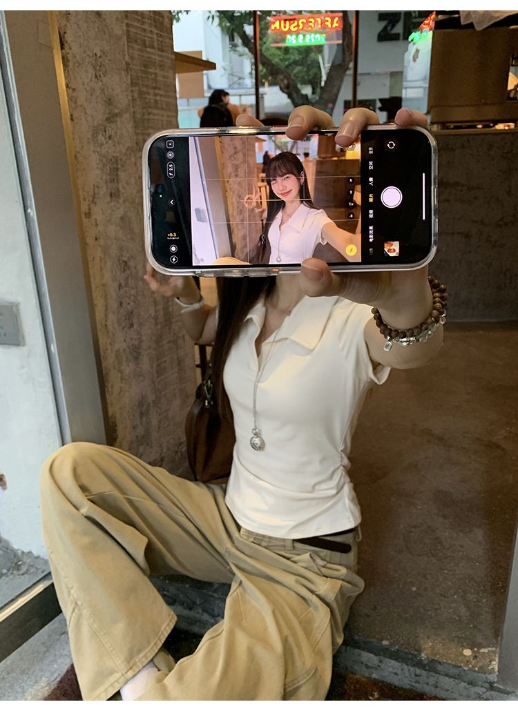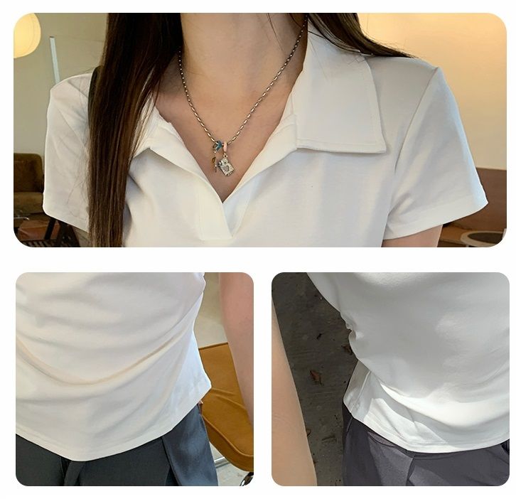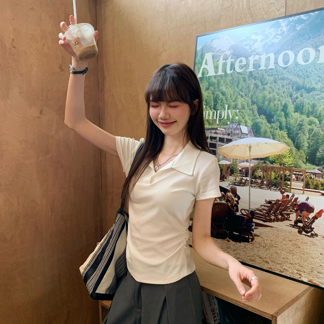 翻領純色褶皺收腰短袖T恤(預購)vic005423