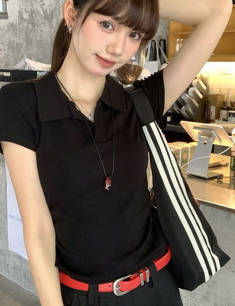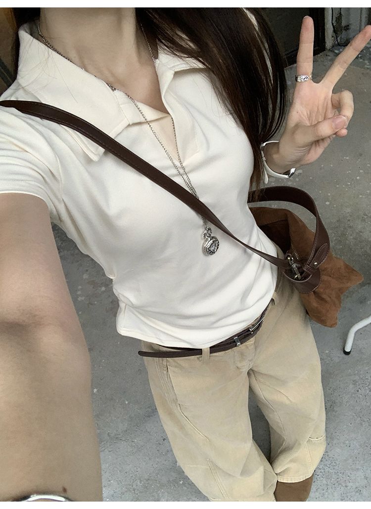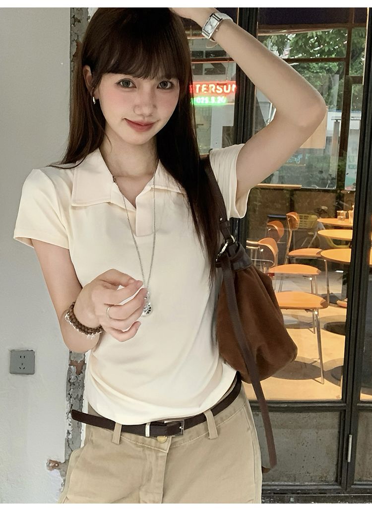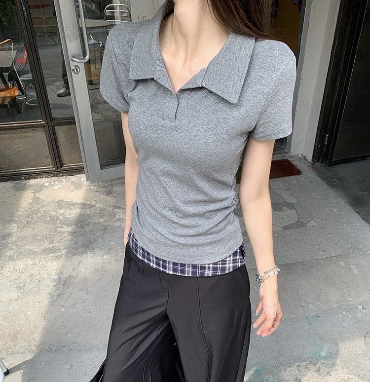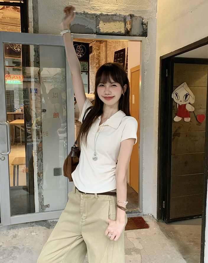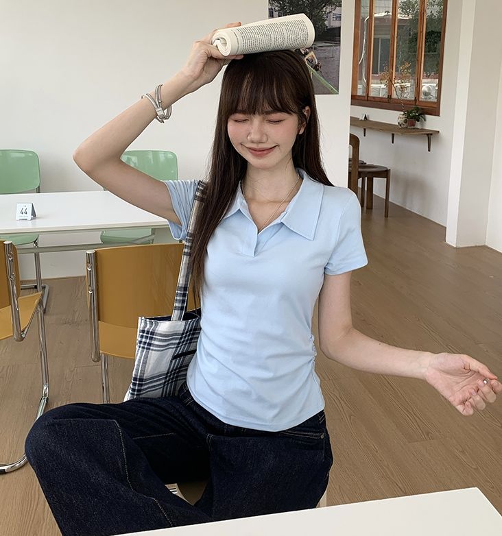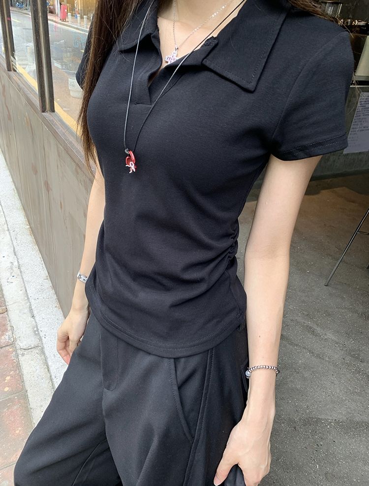 翻領純色褶皺收腰短袖T恤