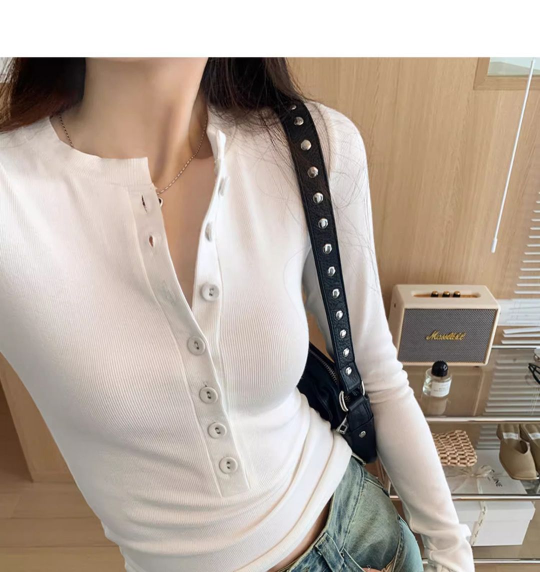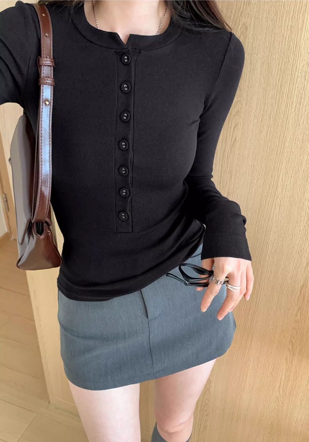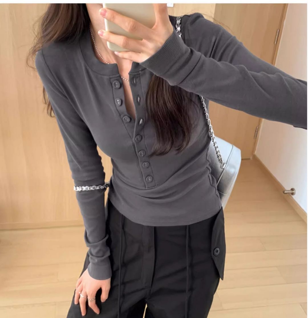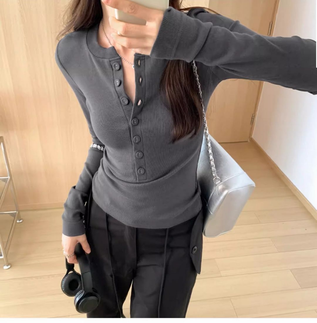 薄款修身純色鈕扣長袖T恤(預購)pn003080