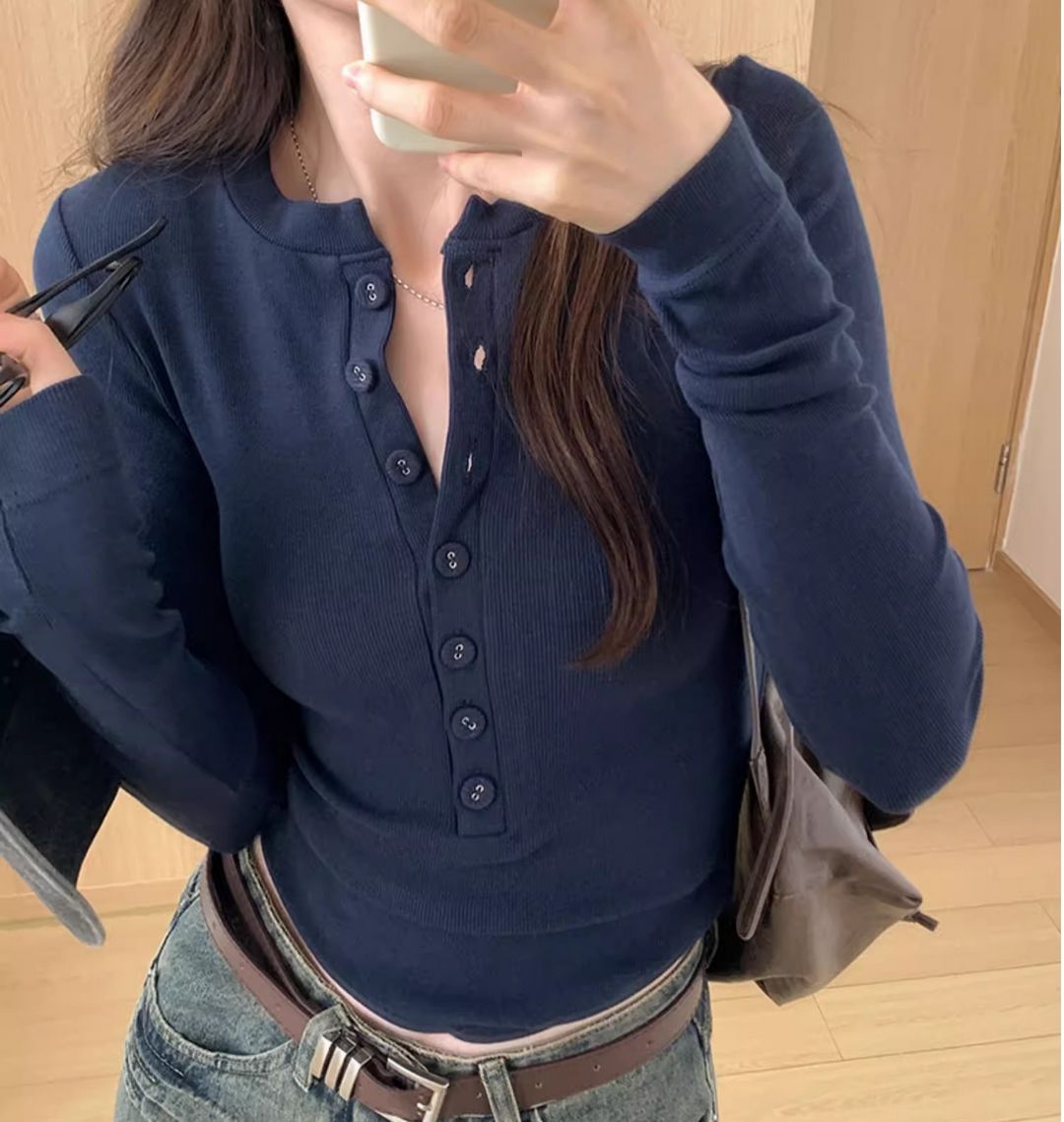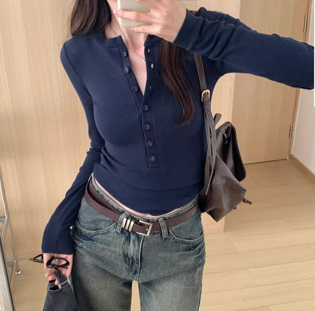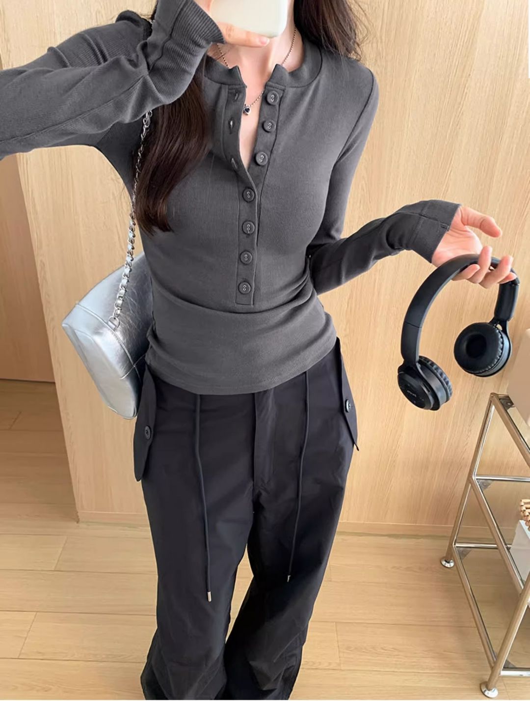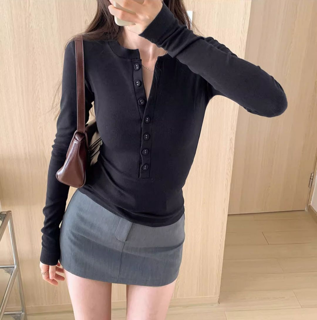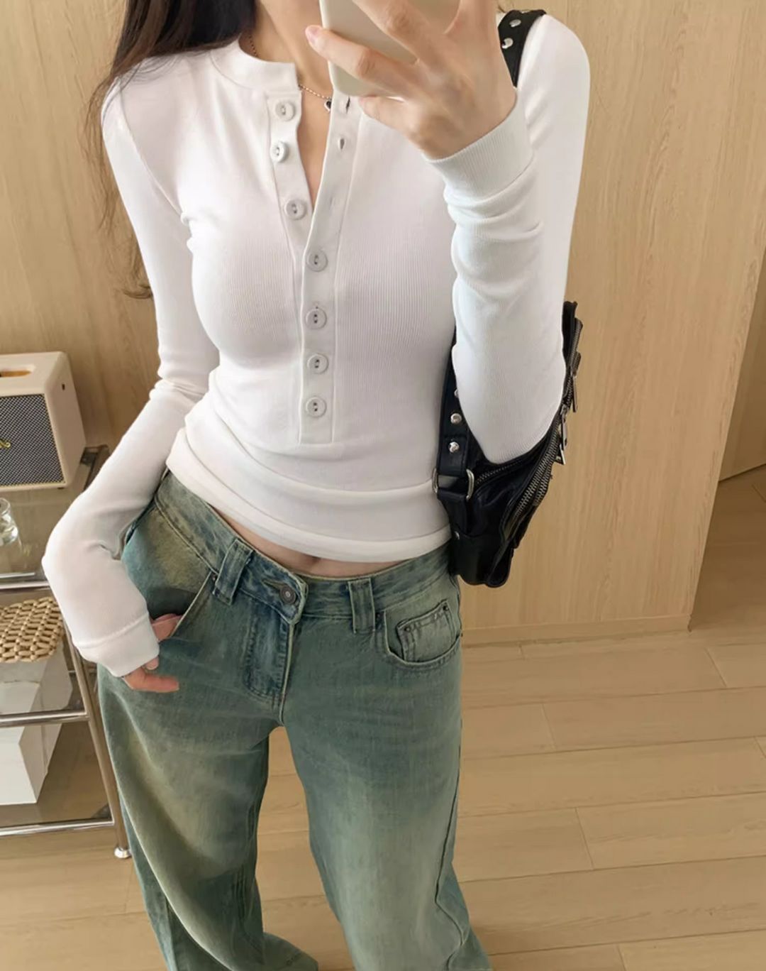 薄款修身純色鈕扣長袖T恤(預購)pn003080