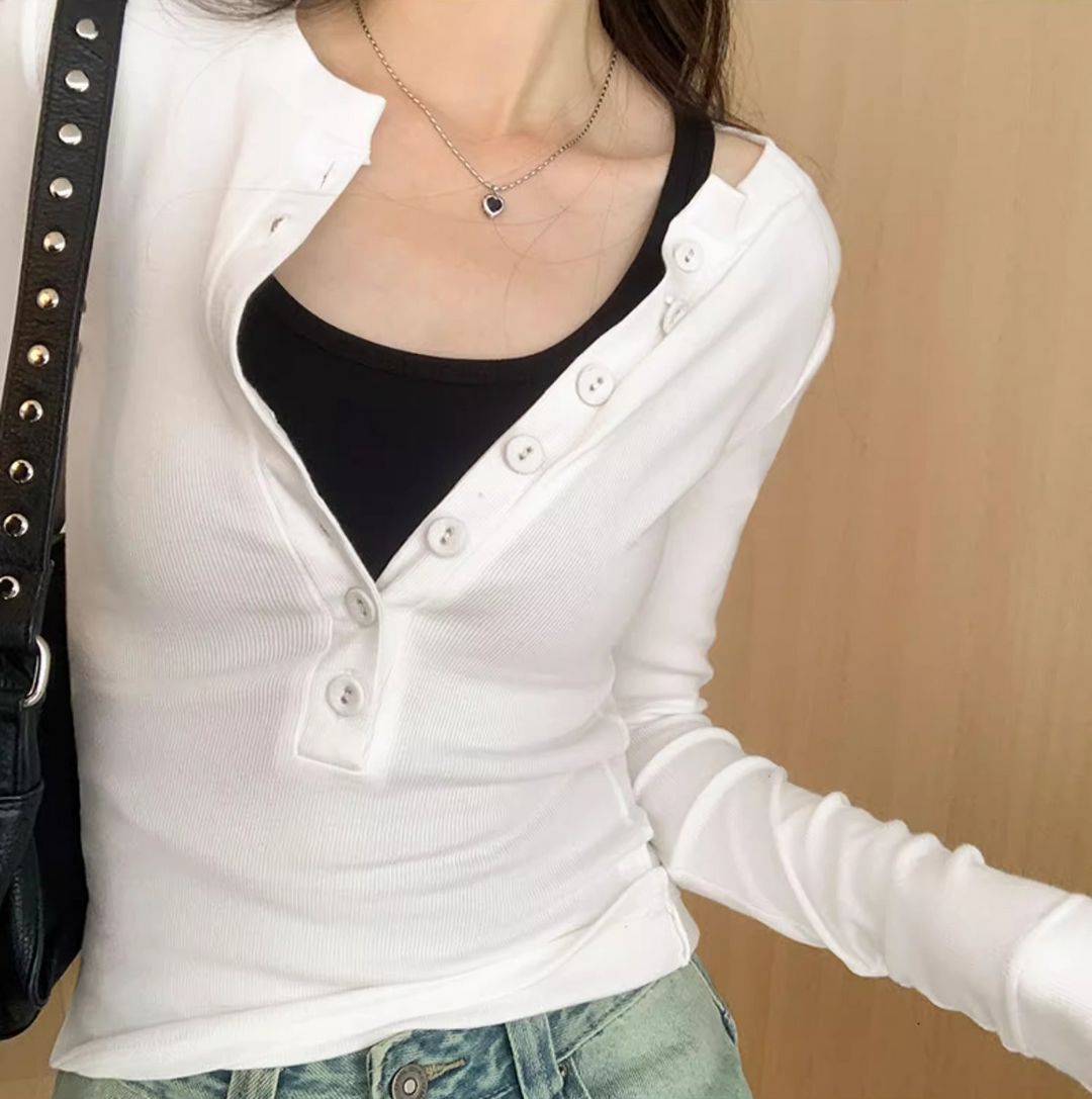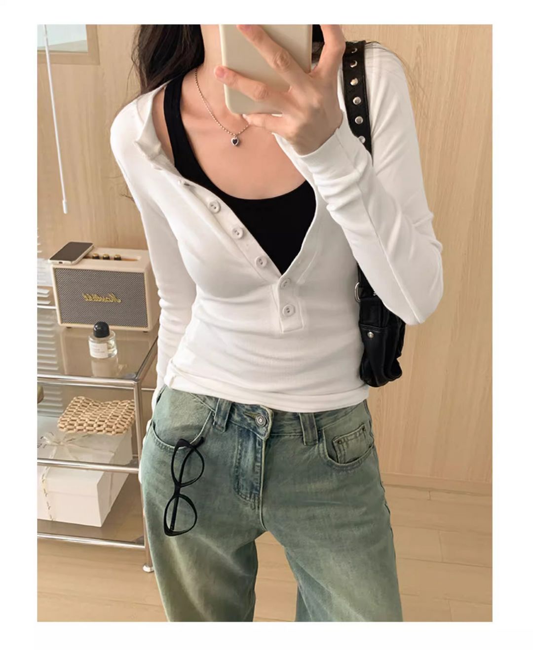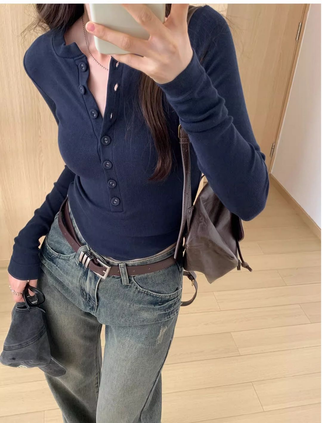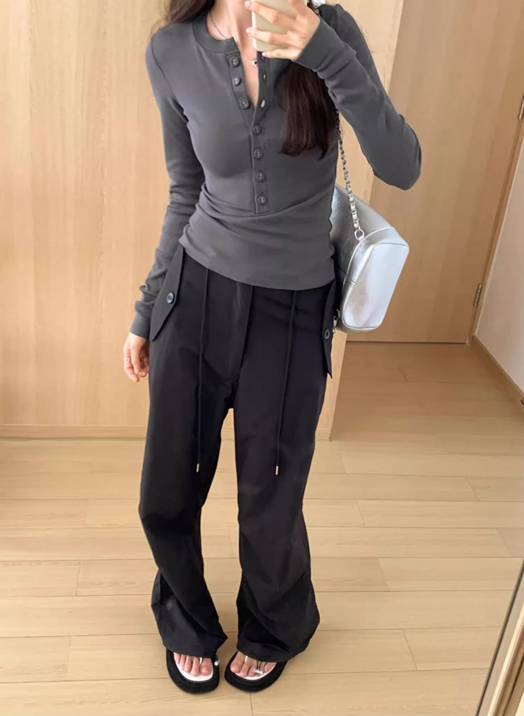 薄款修身純色鈕扣長袖T恤(預購)pn003080