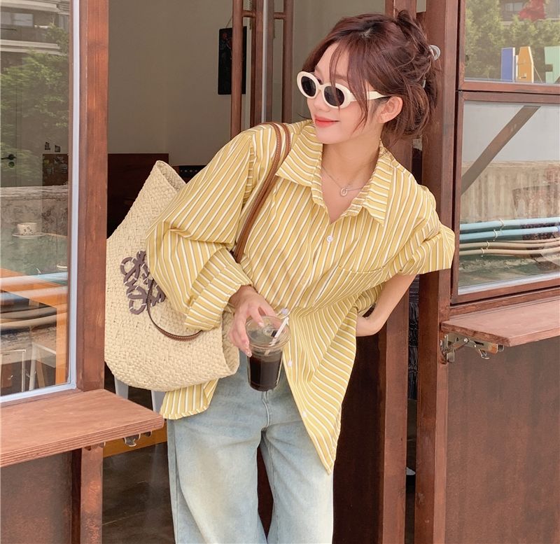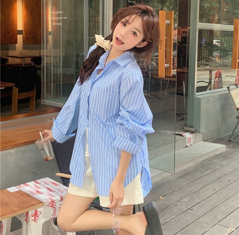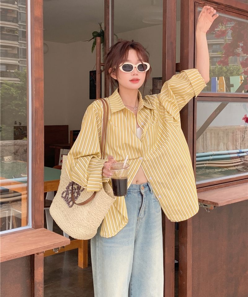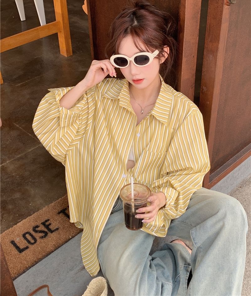 韓版休閒寬鬆長袖條紋襯衫防曬外套(預購)vic005401