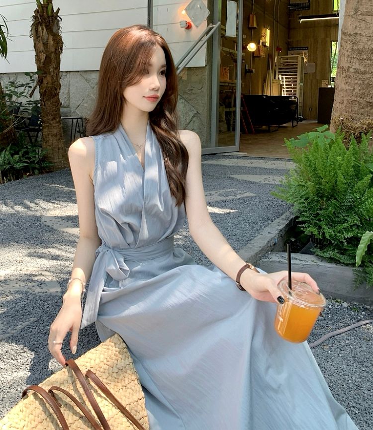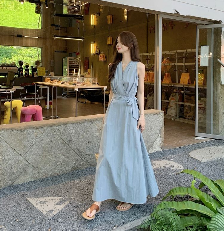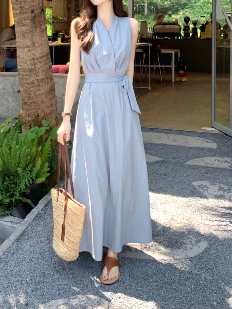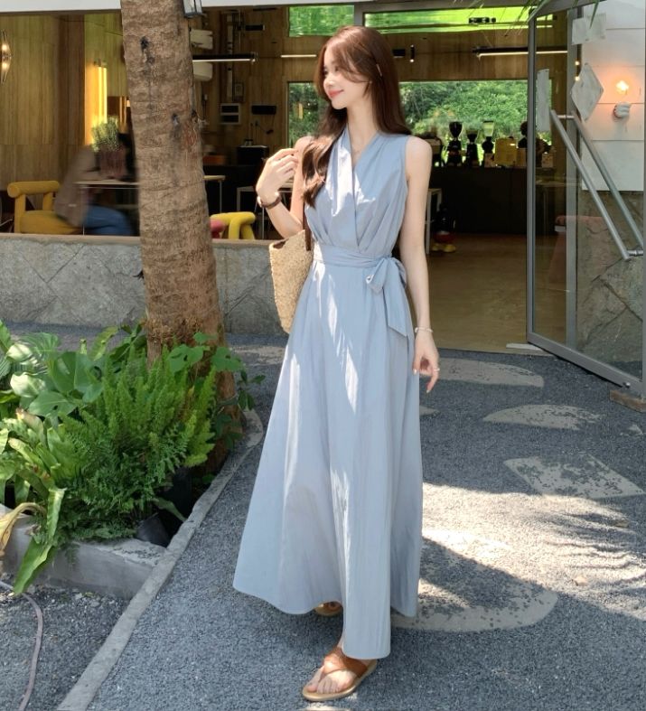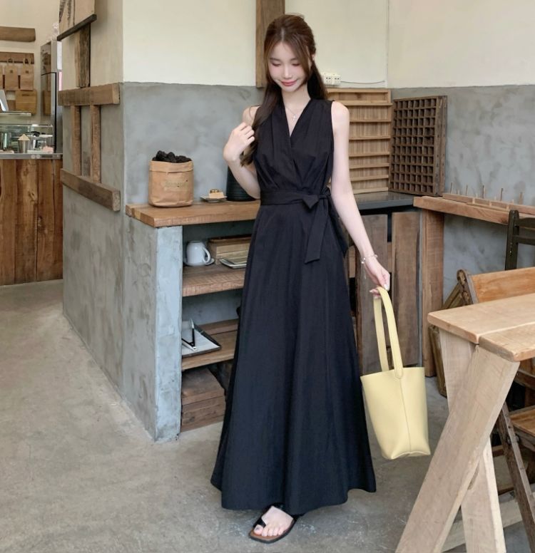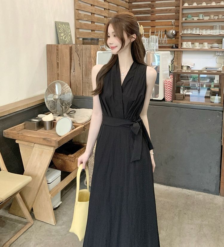 V領壓褶綁帶收腰無袖連衣裙洋裝(預購)vic005414