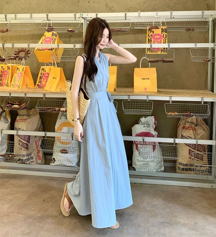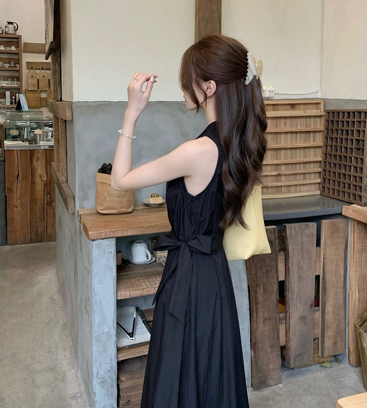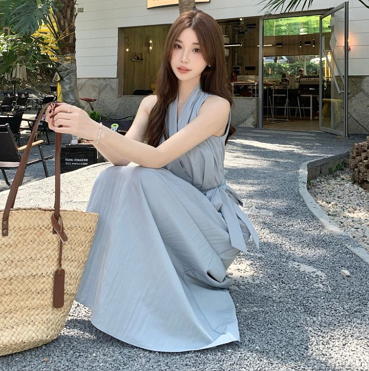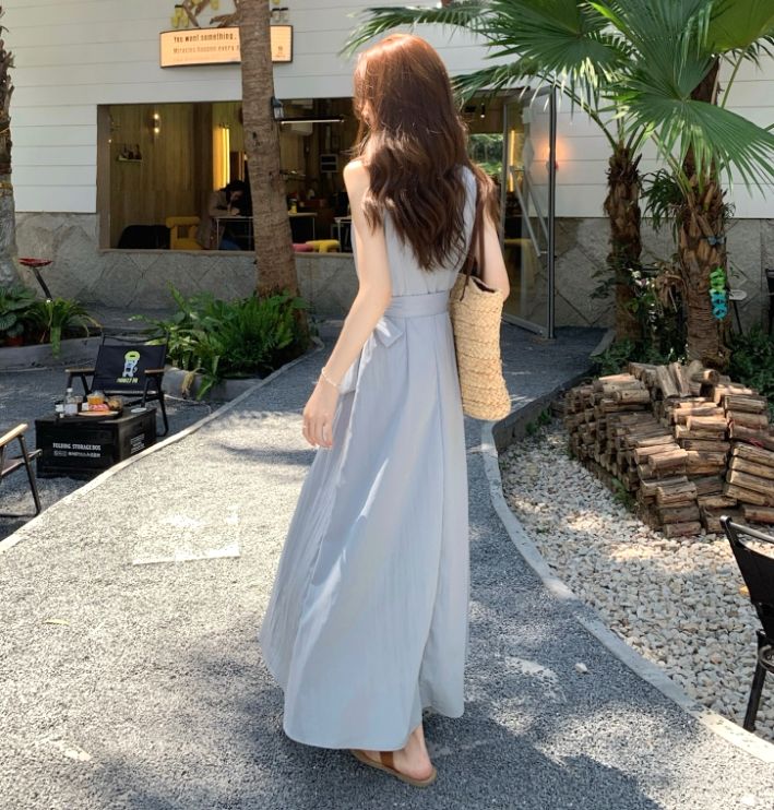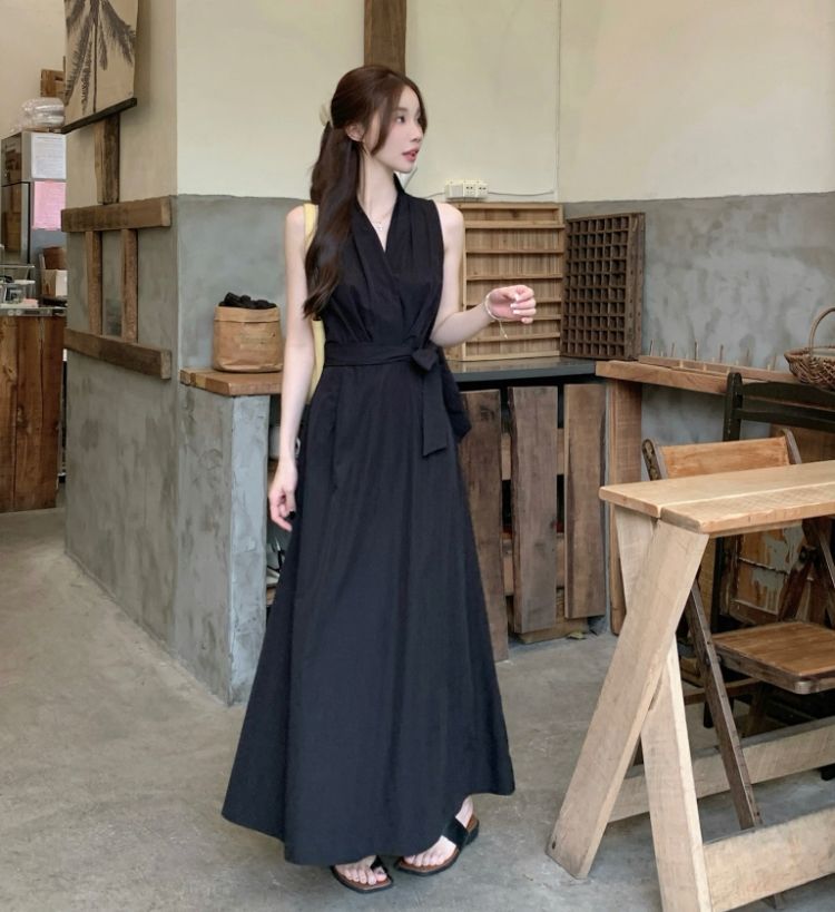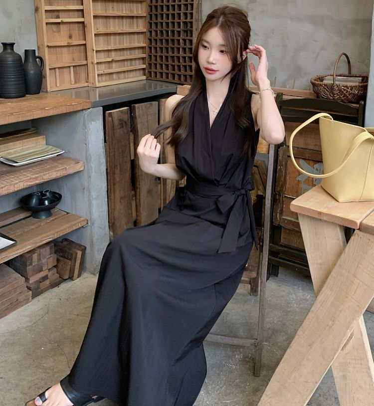 V領壓褶綁帶收腰無袖連衣裙洋裝(預購)vic005414