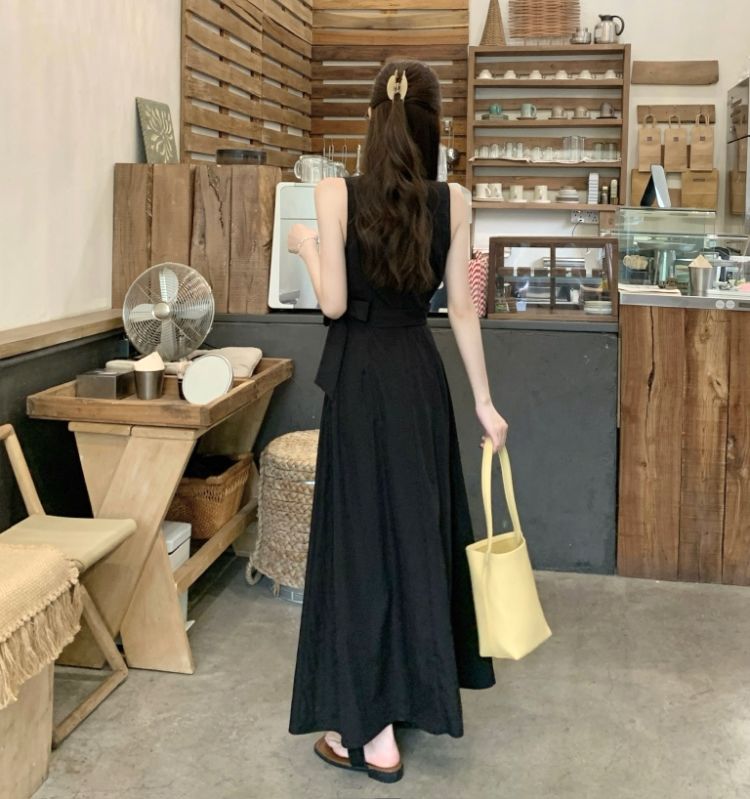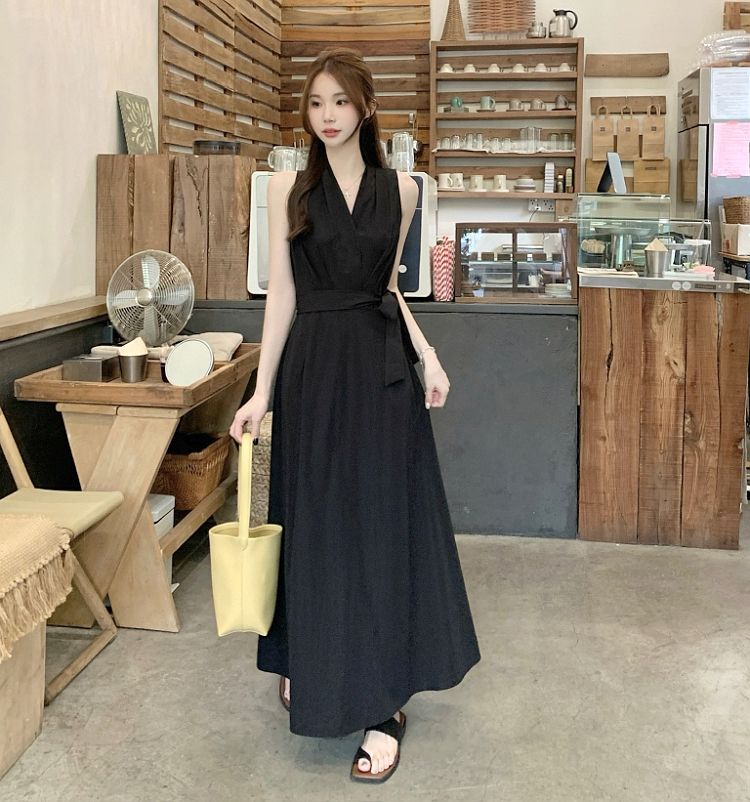 V領壓褶綁帶收腰無袖連衣裙洋裝
