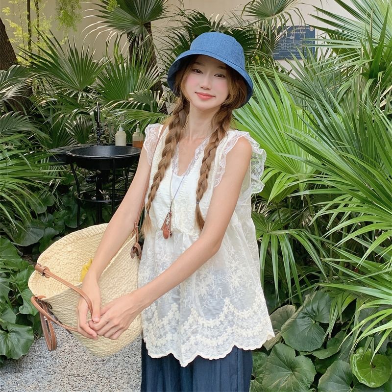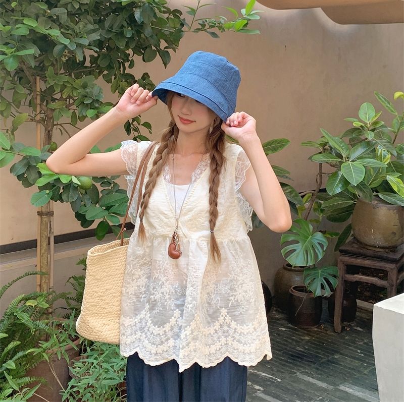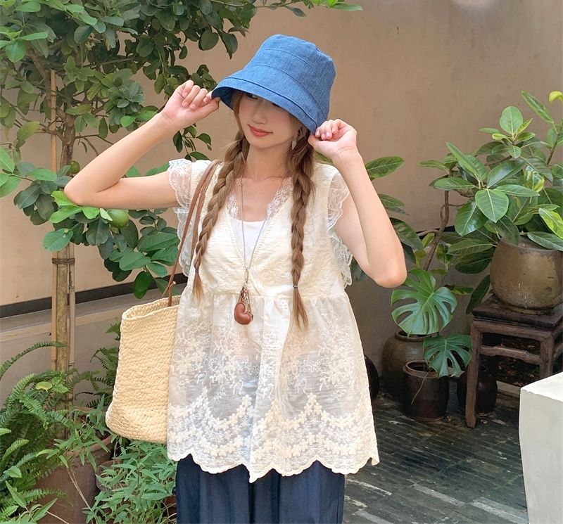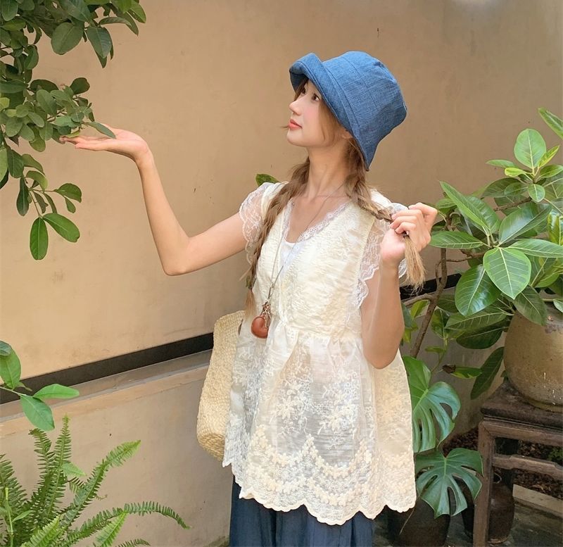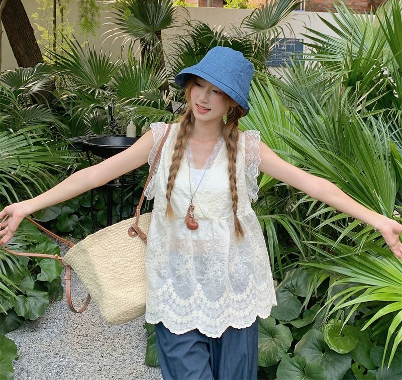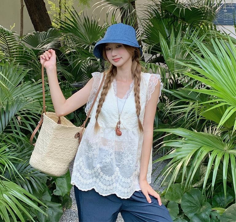 V領蕾絲花邊刺繡背心上衣(預購)vic005373